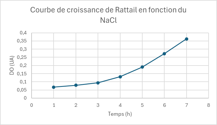 La tendance se confirme. Le NaCl ralenti la croissance de la bactérie. Cependant, on observe que la bactérie a une intensité de bioluminescence plus élevée en présence de NaCl. On peut supposer que le Nacl a 99% de pureté induit un stress à la bactérie ce qui doit augmenter l'activité de la luciférase bactérienne.