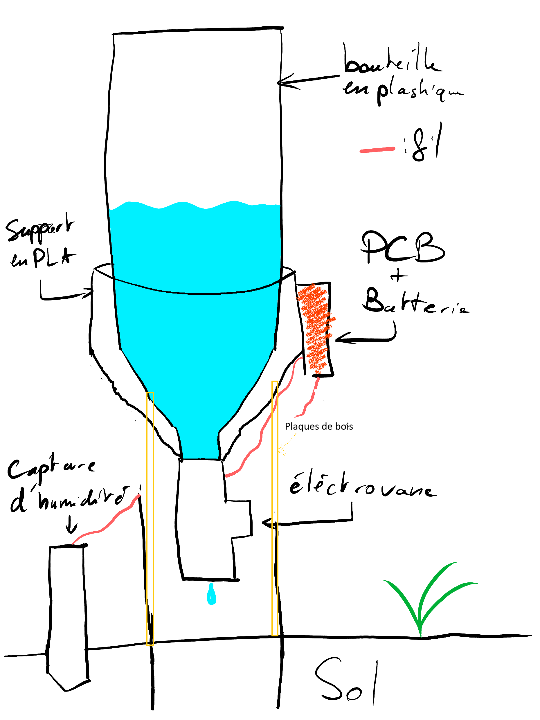 Idée : Nous allons créer un système par plante, simplifié le plus possible, pour éviter d'avoir des problèmes de fonctionnement et des fils encombrants. Par plante, il faudrait faire un PCB sur mesure avec un micro-controleur, un capteur d'humidité et une éléctrovanne.