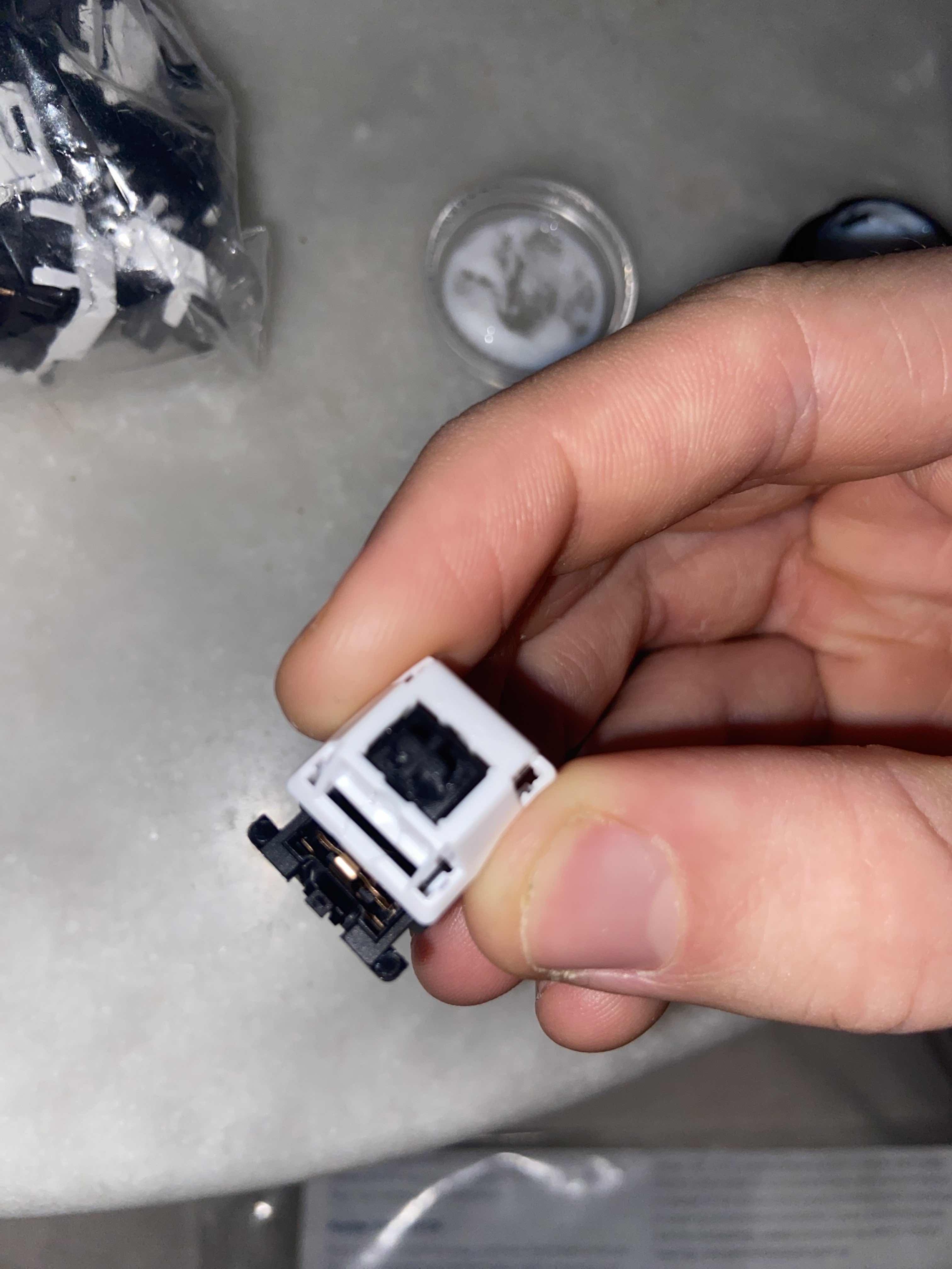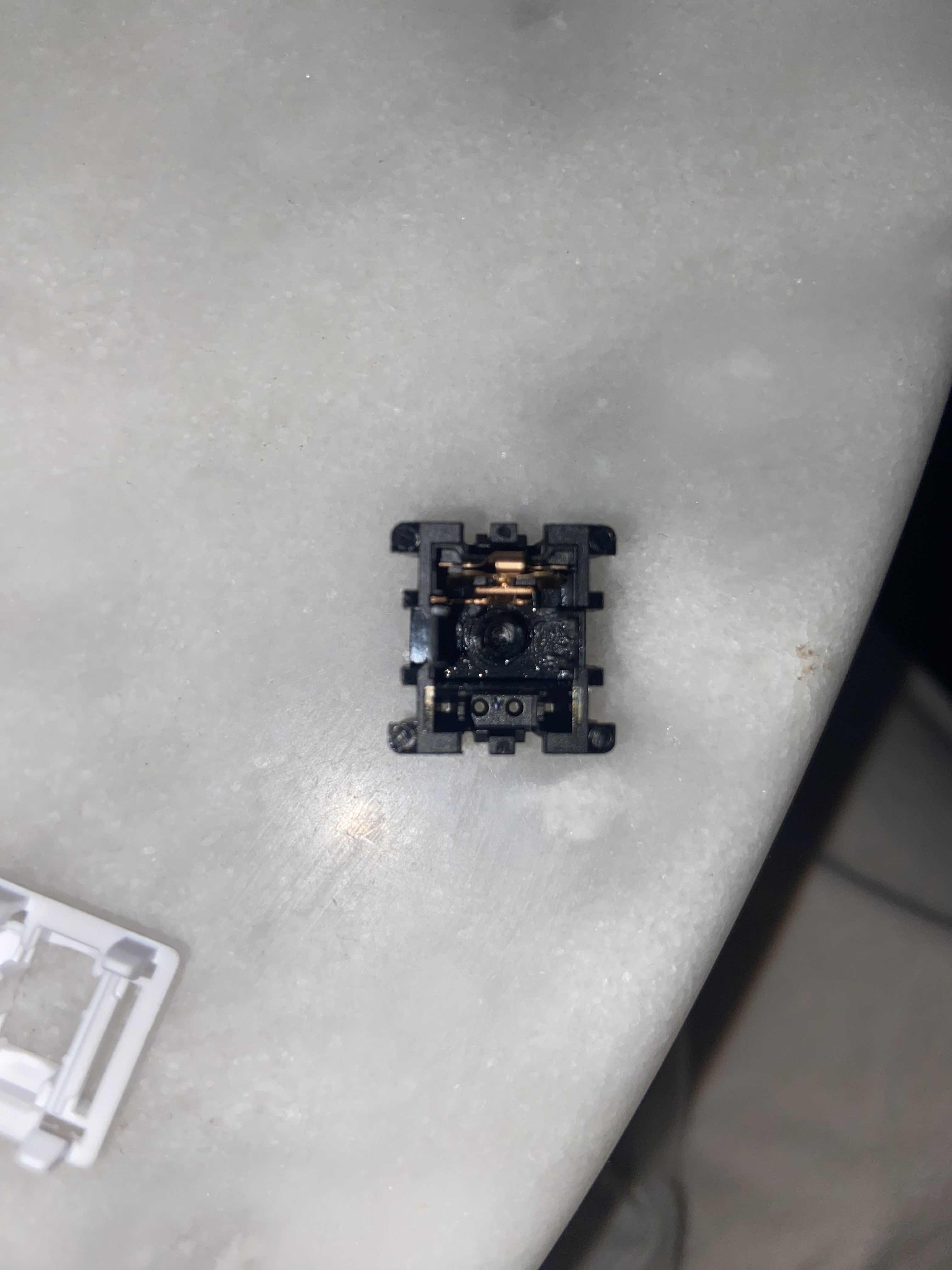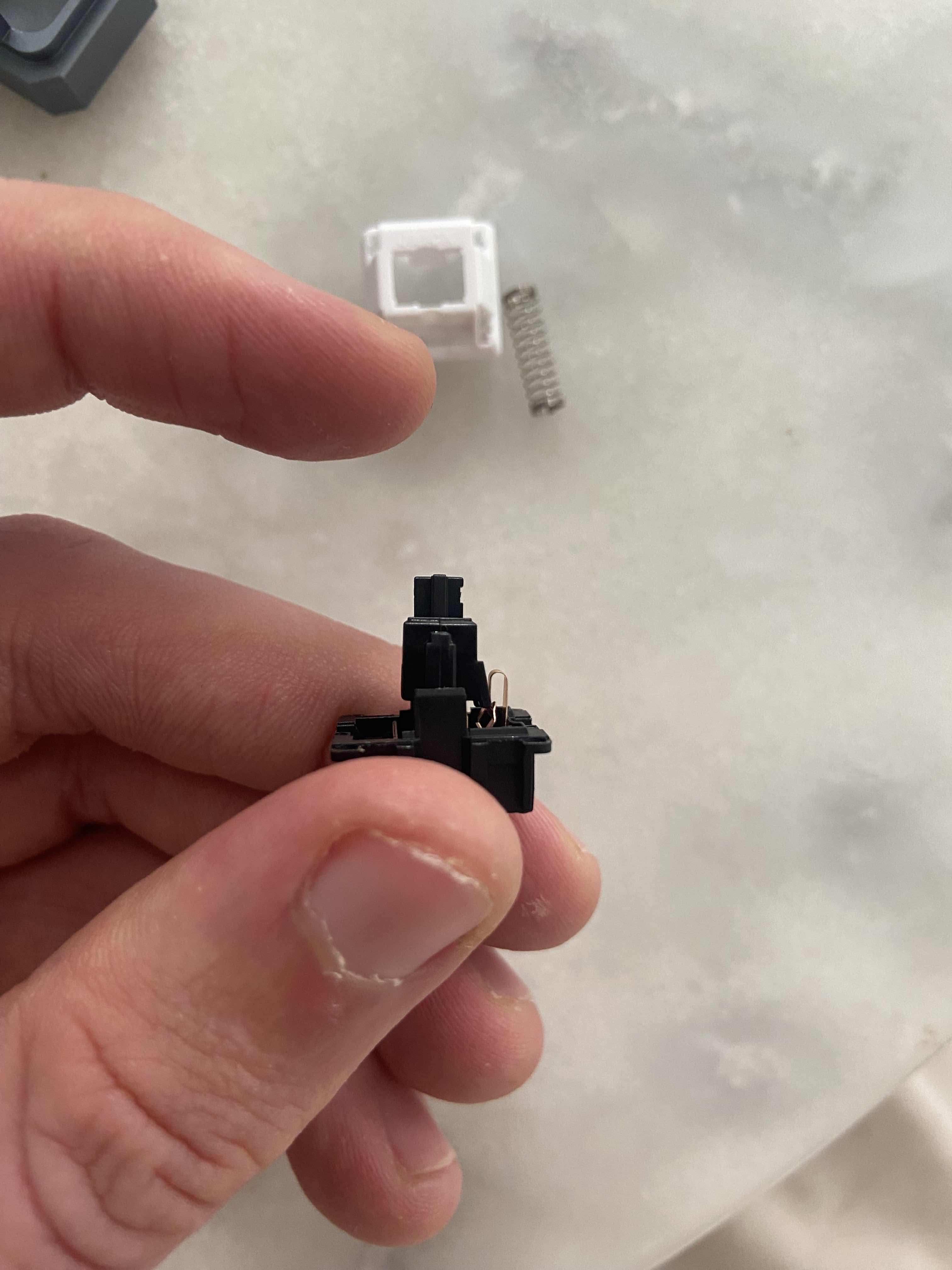 Lors du remontage de l'interrupteur, non seulement vous devez vous assurer que la tige s'aligne avec les contacts métalliques, mais vous devez également vous assurer que la partie en plastique complète du boîtier supérieur s'aligne avec la partie métallique.