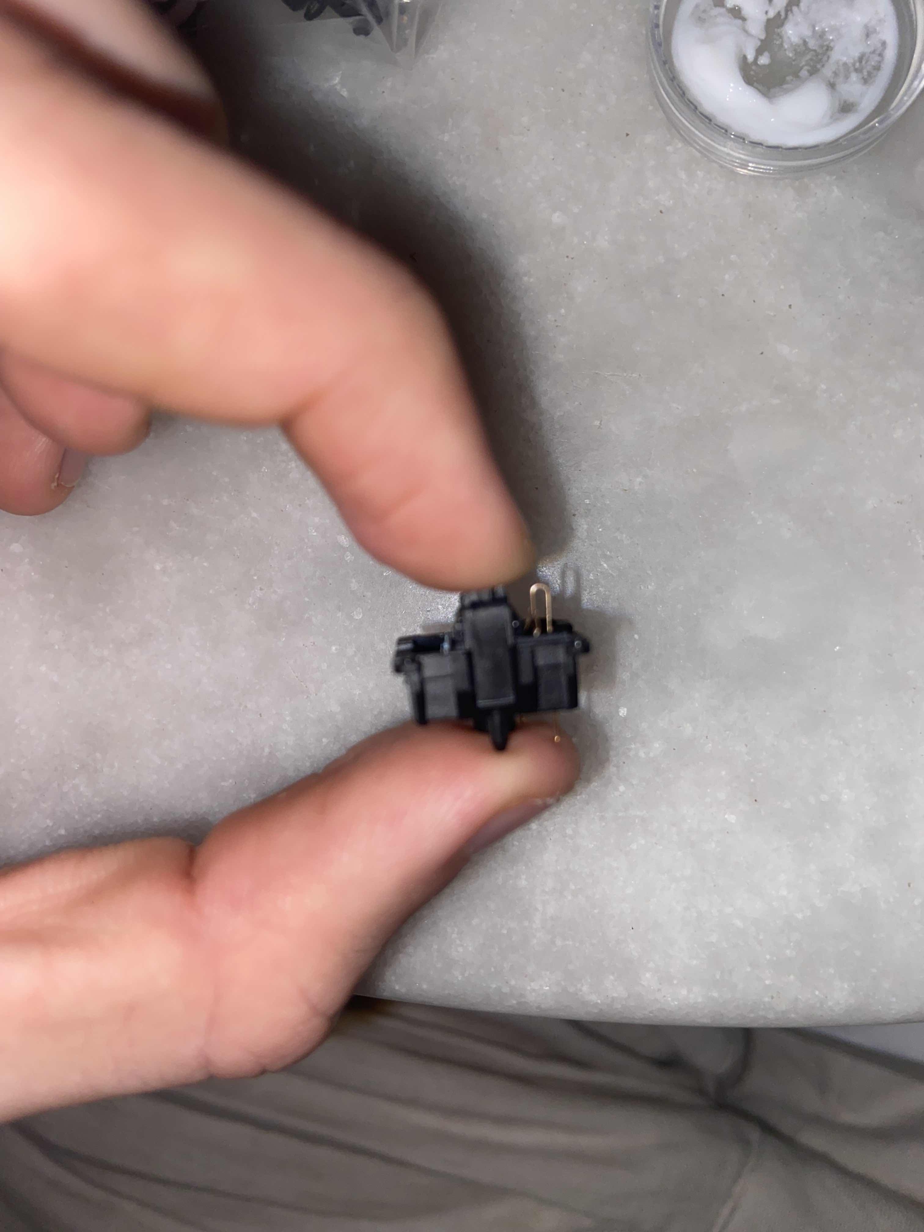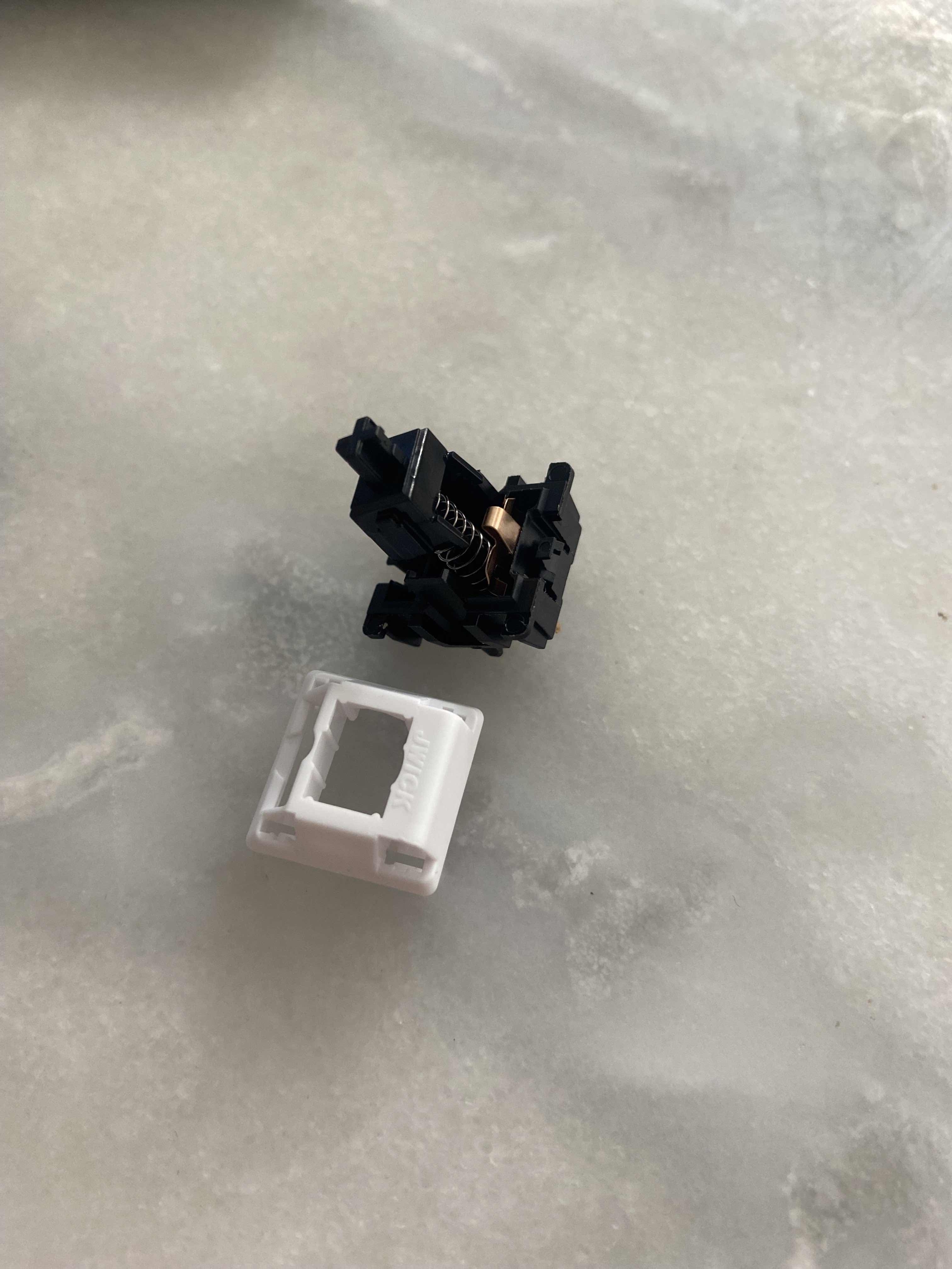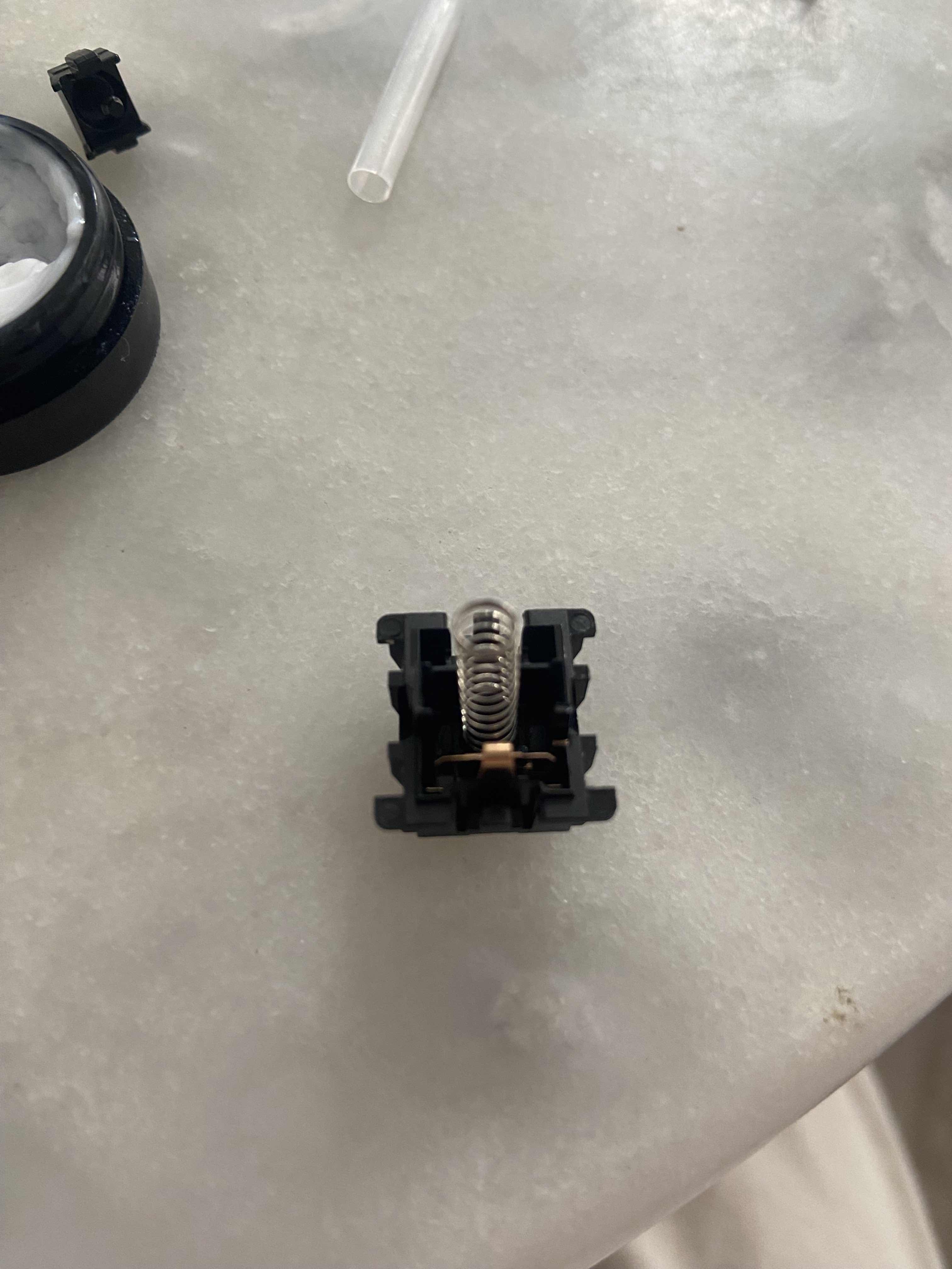 Lors du remontage de l'interrupteur, non seulement vous devez vous assurer que la tige s'aligne avec les contacts métalliques, mais vous devez également vous assurer que la partie en plastique complète du boîtier supérieur s'aligne avec la partie métallique.