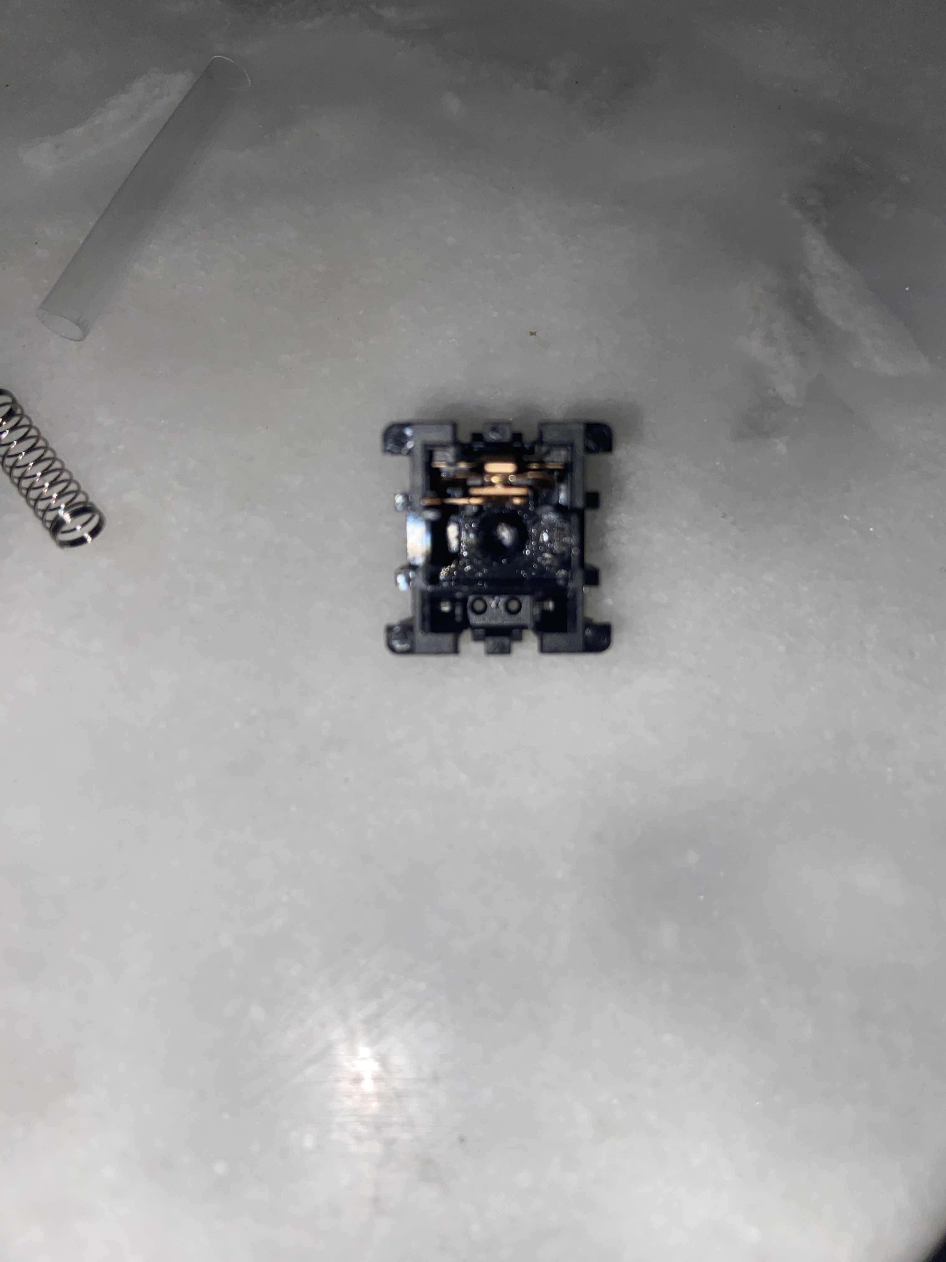 L'intérieur de l'interrupteur fonctionne en pressant deux contacts métalliques ensemble avec une came coulissante. C'est aussi pourquoi il est si important de lubrifier les interrupteurs, car la pression et dépression constantes des interrupteurs accumulent de l'usure au fil du temps, ce qui finira par casser l'interrupteur en usant le plastique.