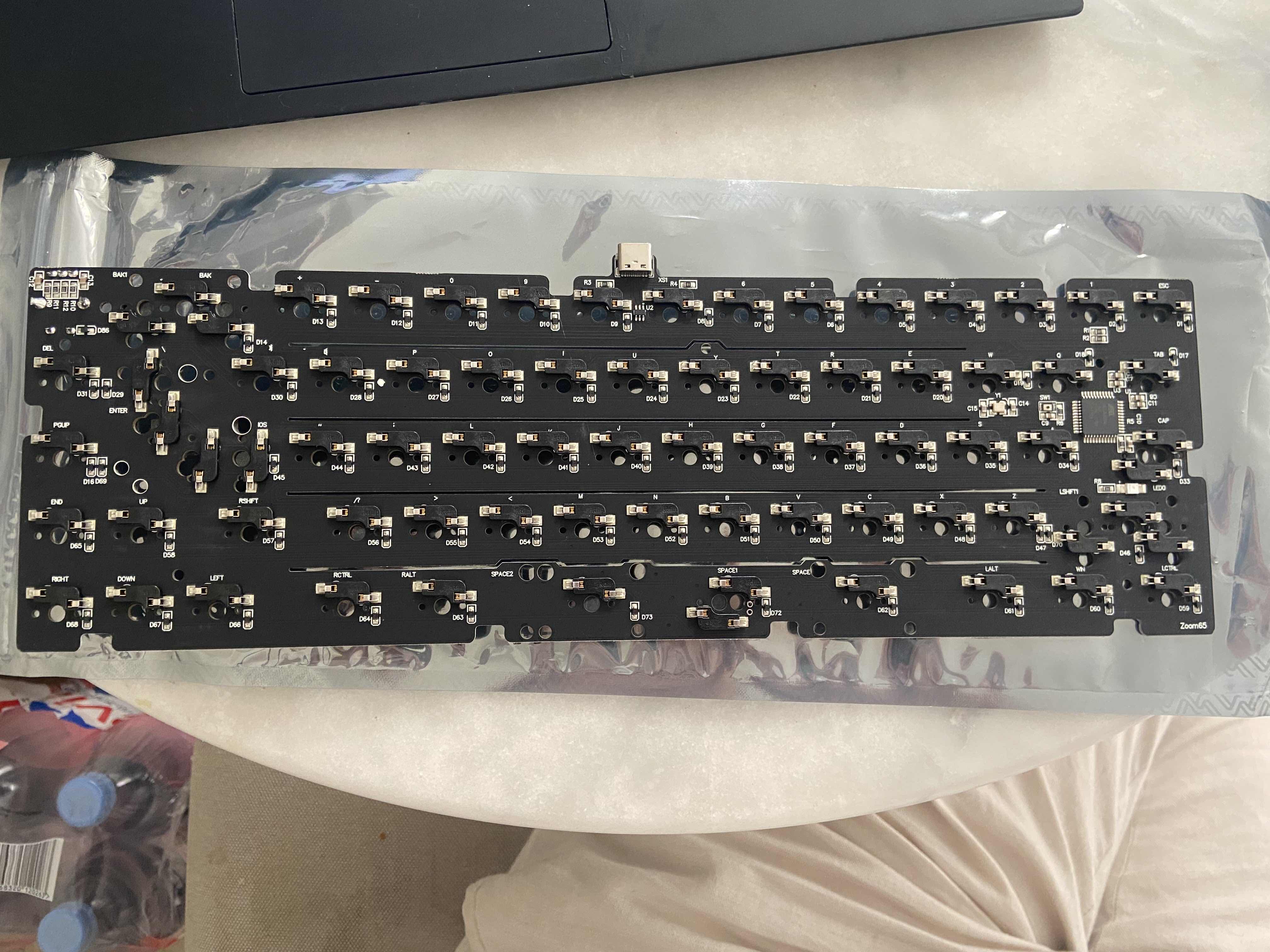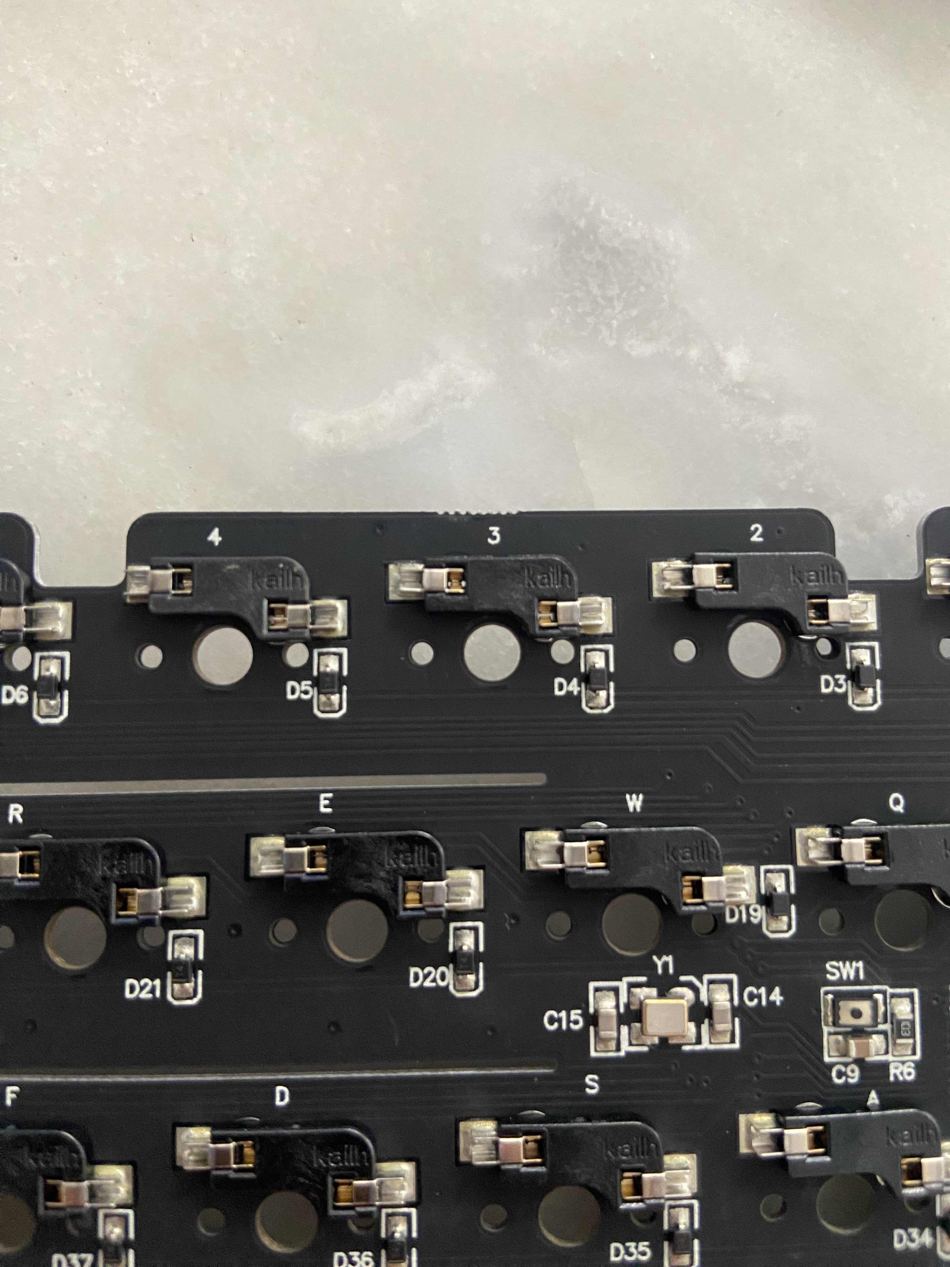Sur le circuit imprimé lui-même, les interrupteurs sont soudés au PCB. Le PCB a des diodes pour chaque interrupteur afin de pouvoir identifier les pressions de touches correctes. Les pistes mènent toutes à un petit circuit intégré, qui exécute un micrologiciel (VIA dans ce cas, qui permet la configuration via un navigateur web, https://www.usevia.app/, si un lecteur décide de se renseigner sur l'achat d'un clavier, je recommande vivement d'acheter un clavier compatible VIA.)