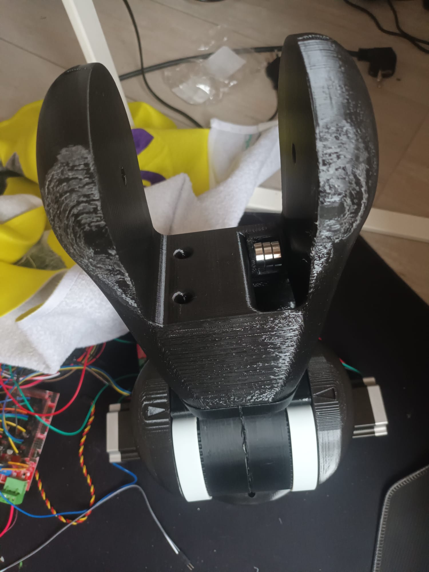 Certaines pièces sont destinées à contenir des moteurs et ne peuvent pas être imprimées en PLA. En raison des contraintes mécaniques et de la chaleur des moteurs, il y a un risque de torsion des pièces. Il fallait donc utiliser des filaments comme l'ABS ou le PETG. Je me suis donc rendu au FABLAB pour imprimer en ABS, mais ma première tentative a échoué : la pièce a subi un fort warping .