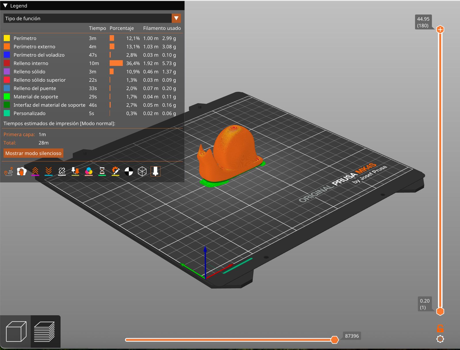 Importation du modèle dans PrusaSlicer, choix des paramètres d’impression par défaut (PLA, hauteur de couche standard), puis génération du G-code.