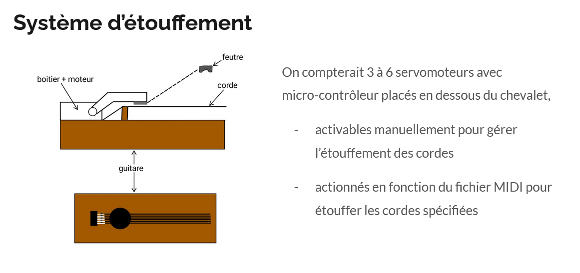 The part is a prototype used in a system designed to provide right-hand control on a guitar for people with right-side paralysis (hemiparesis). Connected to a servo motor, it allows a string to be muted based on commands generated from a .mid score. This makes it possible to play specific chords, or even a monophonic melody if all strings are muted except one.