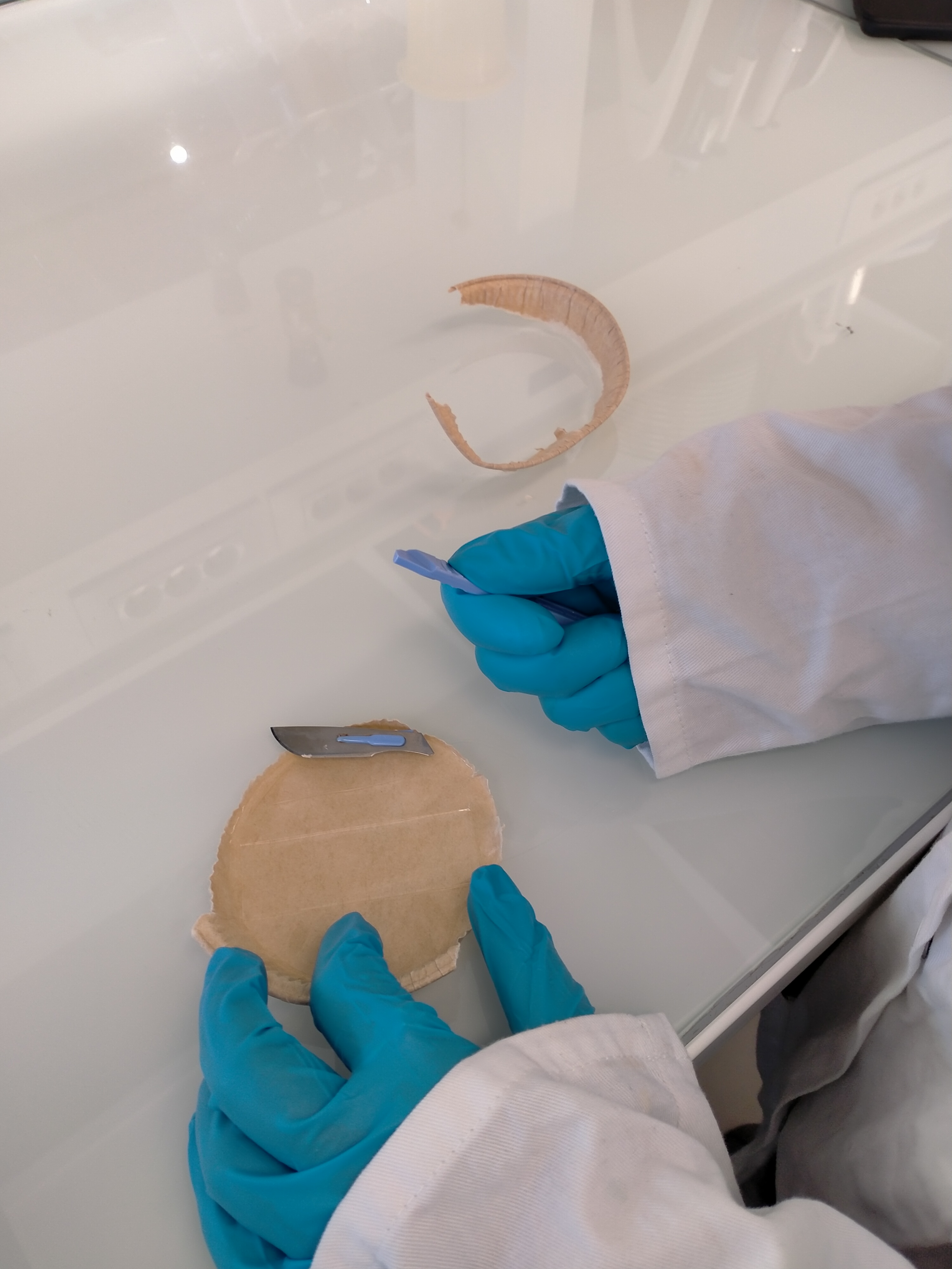 - A l'aide d'un scalpel découper délicatement le plat en carton afin d'en décoller le PDMS solidifié et récupérer les lames. (Vraiment délicatement, pas comme nous…)