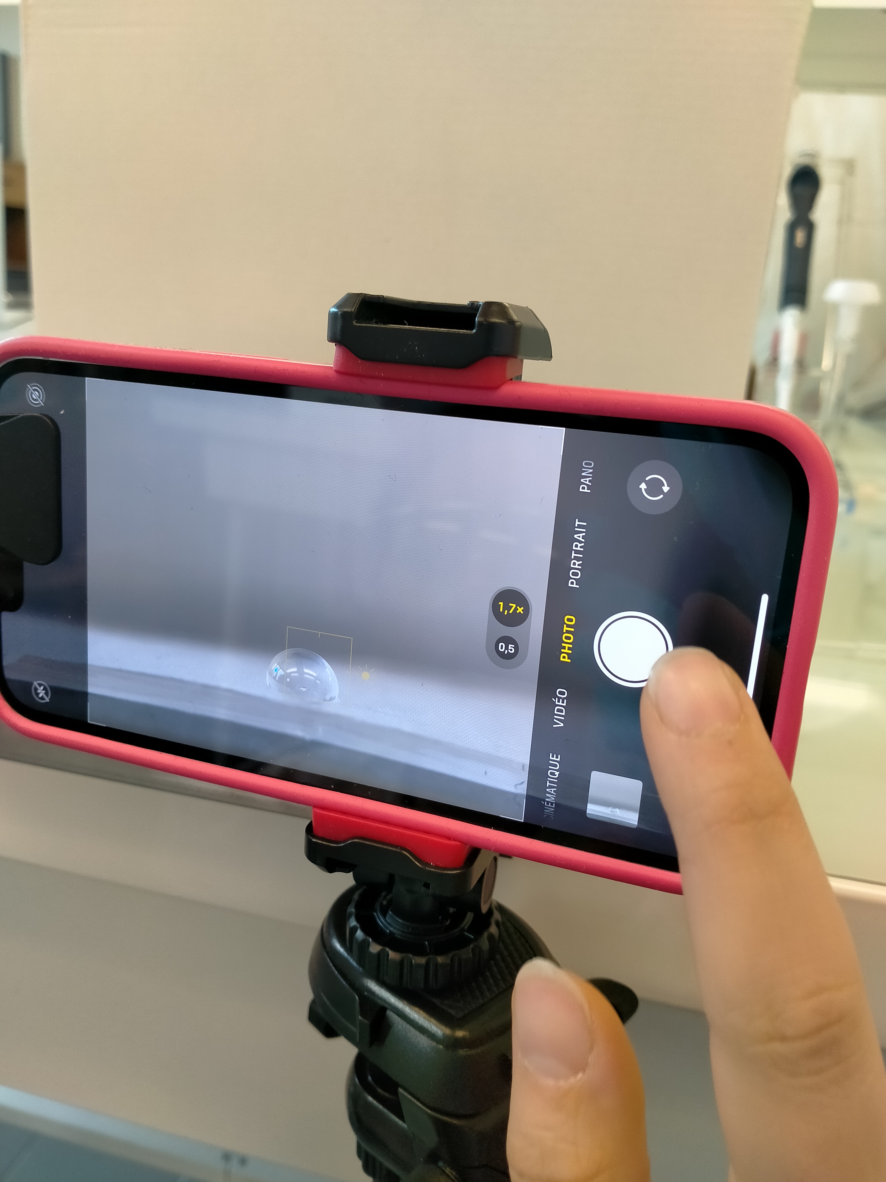 Le plus délicat dans cette partie est la position du téléphone par rapport à notre surface PDMS. Le plus important est de rester fixe afin de ne pas modifier nos valeurs d'angle.