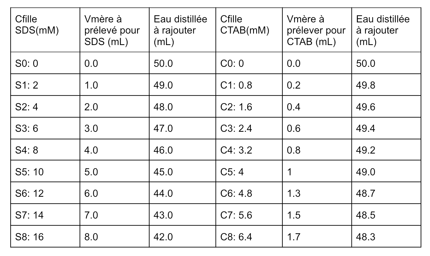 Réaliser la procédure de dilution pour toutes les concentrations nécessaires de SDS et CTAB. L’idéal est de se diviser en 2 groupes de 3 pour une organisation optimale.