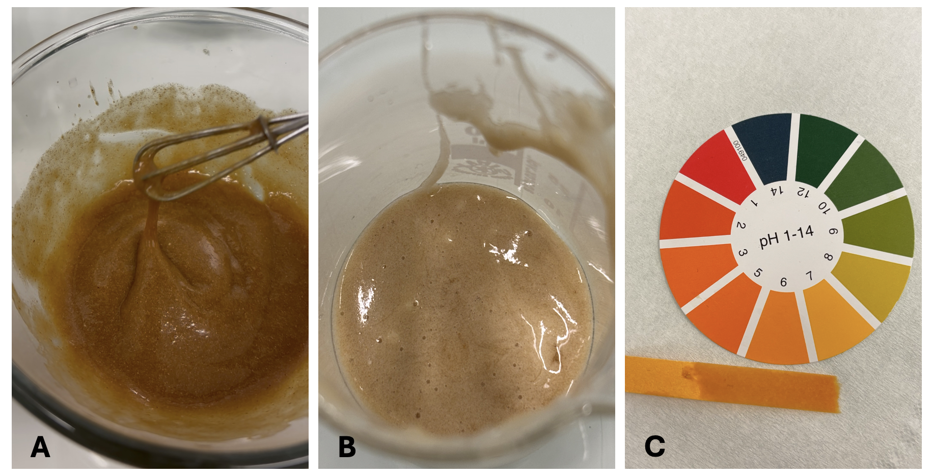 Figure 2. Évolution des caractéristiques physiques et organoleptiques du gel au cours des tests de formulation. A : Gel observé lors des tests 2 à 4, 2e formulation. B : Gel final après tests 5 à 7, 3e formulation. C : Mesure du pH du gel final à l’aide de bandelettes indicatrices.