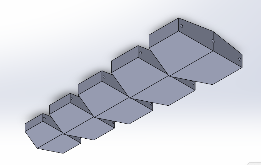 D'autres modélisations semblables à des vertèbres ont été réalisées. La première vertèbre est dite "plate", le bras formé par ces vertèbres ne peut bouger que de gauche à droite. La seconde vertèbre est en forme de triangle, le bras peut donc s'articuler autourde trois directions. Pour assembler les pièces de la seconde vertèbre nous avons choisi d'utiliser une liaison rotule. Au sommet de la pièce, on place une sphère et un réceptacle en dessous de la pièce.