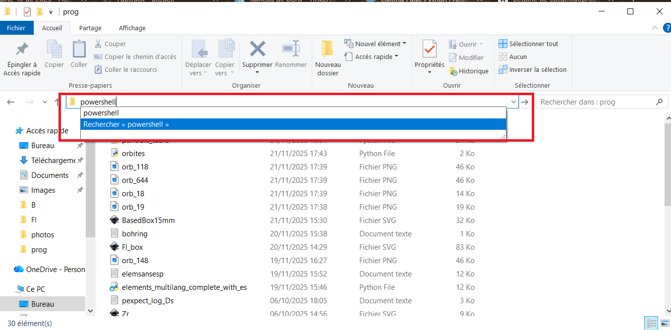 Sur windows, dans le dossier contenant le programme taper "powershell" dans la barre au dessus des fichiers.