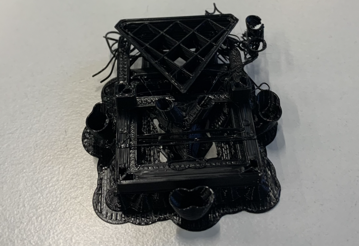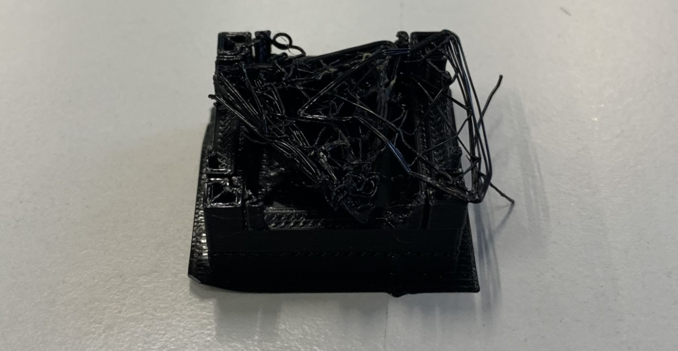 Lors de l'impression de l'objet, on a eu plusieurs échec car l'objet s'imprimait mal ou bien il glissait de la surface d'impression, ce qui nous donne le résultat suivant :
