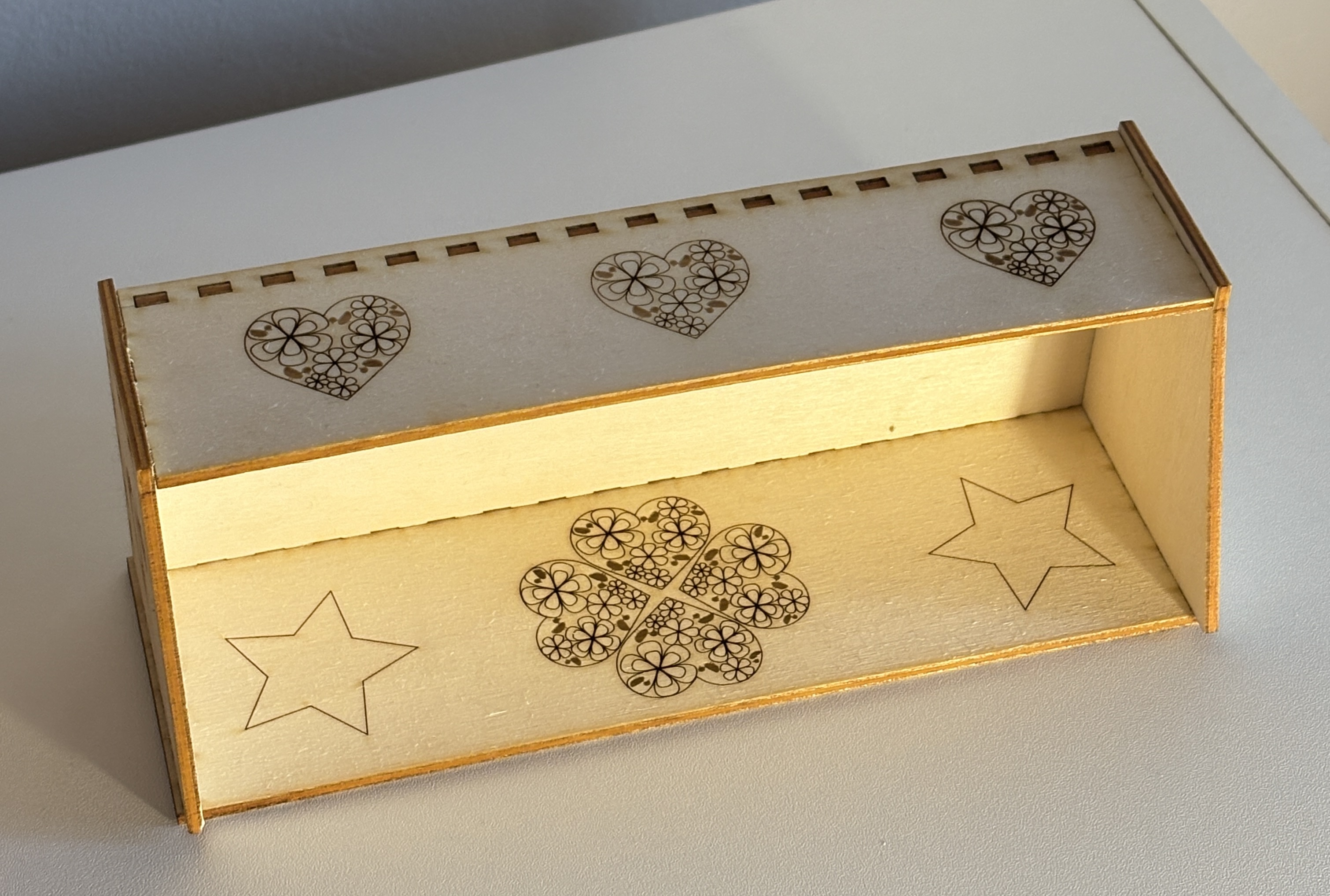 Le marquage est fait sur les éléments décoratifs, tels que les fleurs et les cœurs. Nous obtenons ainsi un contraste visuel de la gravure.