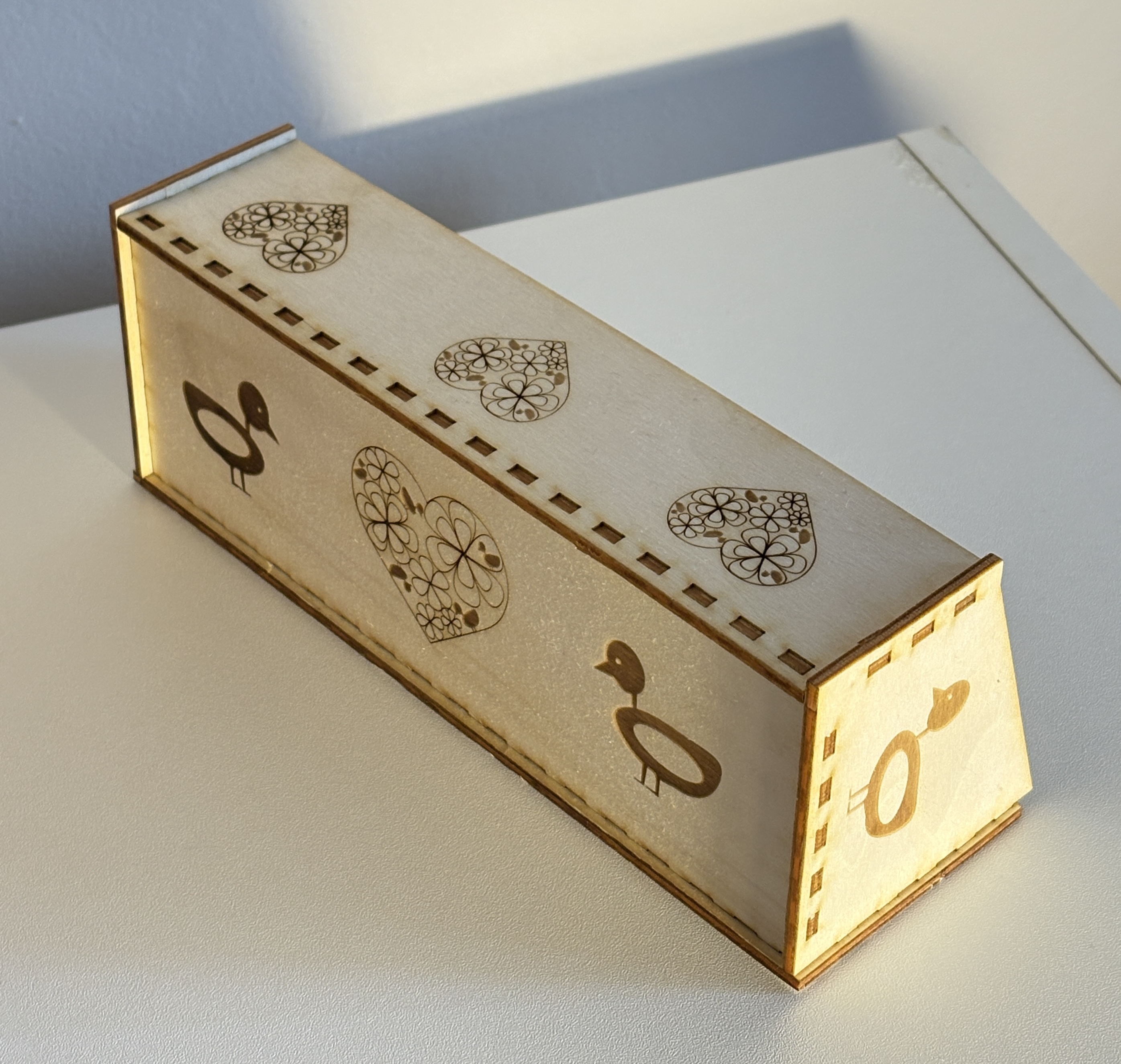 Cependant, sa faible épaisseur rend l'objet relativement fragile. Lors de l'étape d'assemblage, nous avons été confrontées à la rupture des fibres du bois sur certaines pièces. Cela nous a permis de souligner l'importance d'ajuster le jeu entre les pièces.