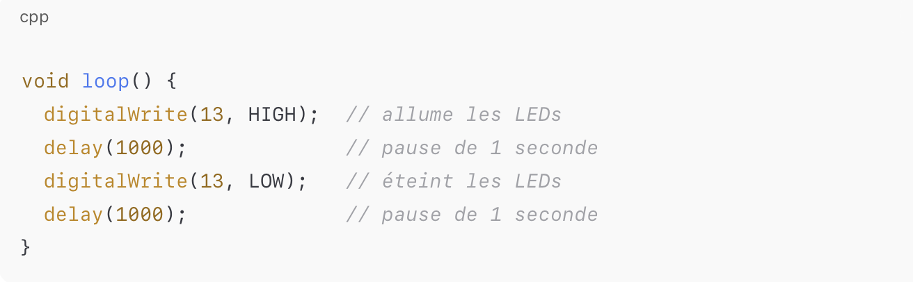 Dans la fonction loop(), la LED est activée puis désactivée avec un intervalle d’une seconde :
