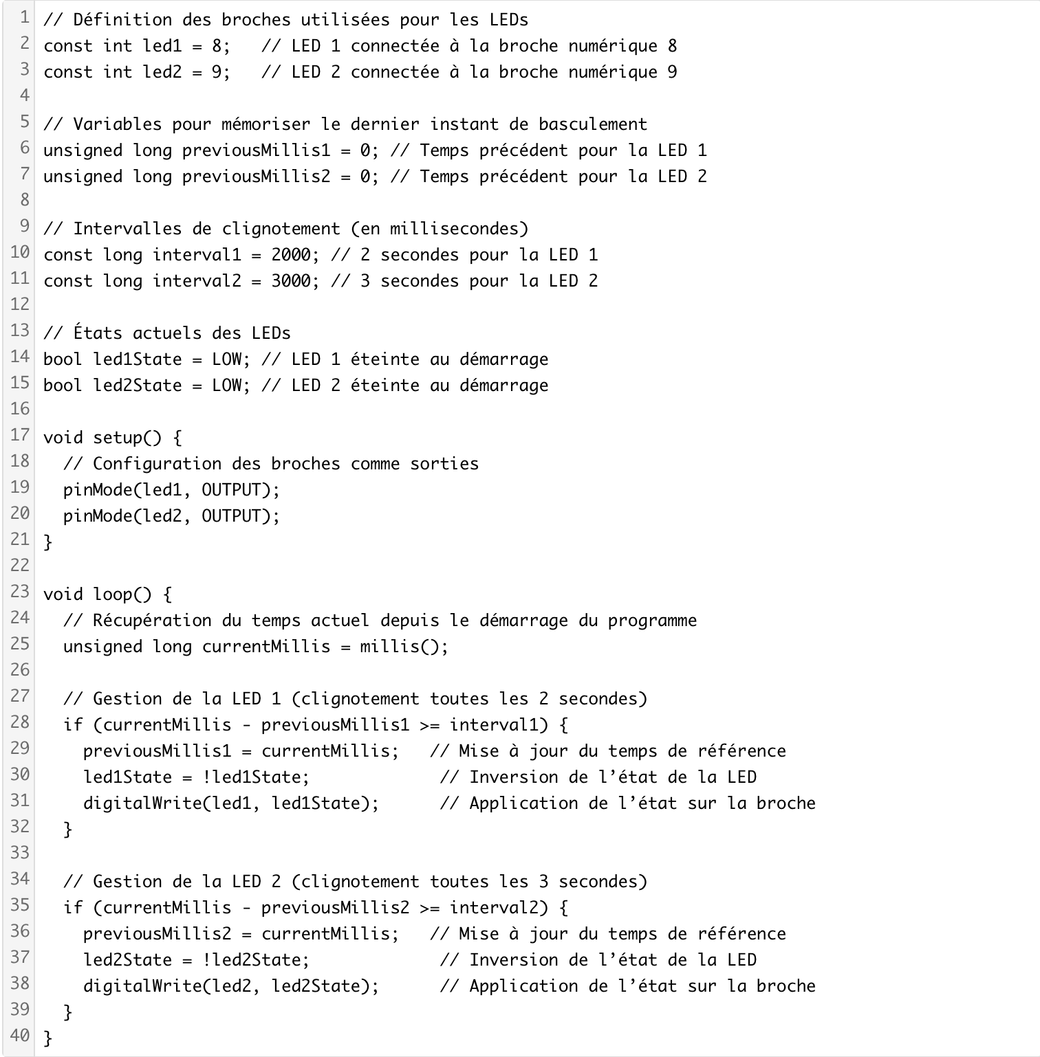 Le programme repose sur l’utilisation de la fonction millis(), qui retourne le nombre de millisecondes écoulées depuis le démarrage de la carte Arduino.