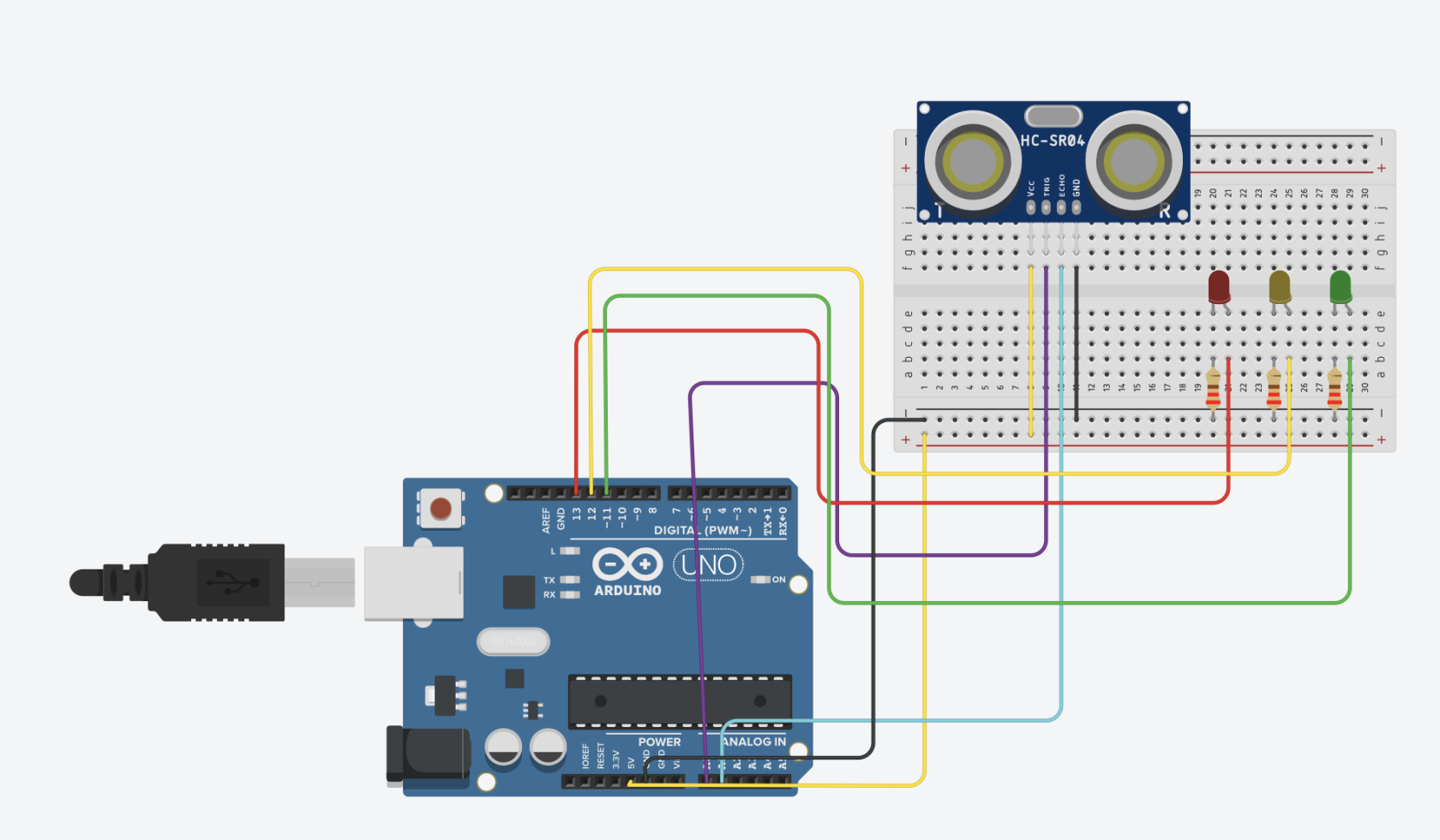 Le programme utilise des conditions (if) pour allumer une LED différente selon la distance mesurée. La simulation sur TinkerCAD a permis de vérifier le bon fonctionnement du câblage et de la logique avant la réalisation réelle.