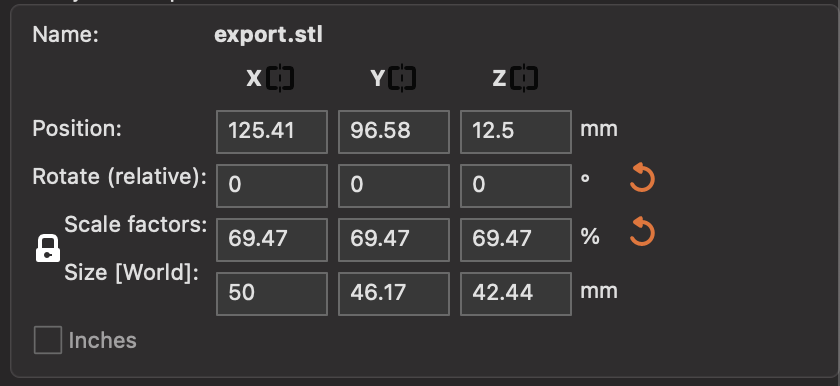 Concernant les dimensions, nous avons appliqué un facteur d’échelle de 70 %, ce qui nous a donné des dimensions de 65 mm sur l’axe X, 57 mm sur l’axe Y et 37 mm sur l’axe Z. L’axe X correspond à la largeur de la pièce, tandis que l’axe Z correspond à la hauteur, L’axe Y correspond à la profondeur de la pièce. Cette dimension a également été choisie en raison du temps d’impression. En conséquence, on peut observer que la texture du tigre n’est pas totalement homogène : les bords et les reliefs restent visibles. Toutefois, avec un temps d’impression plus long, la texture serait nettement meilleure.