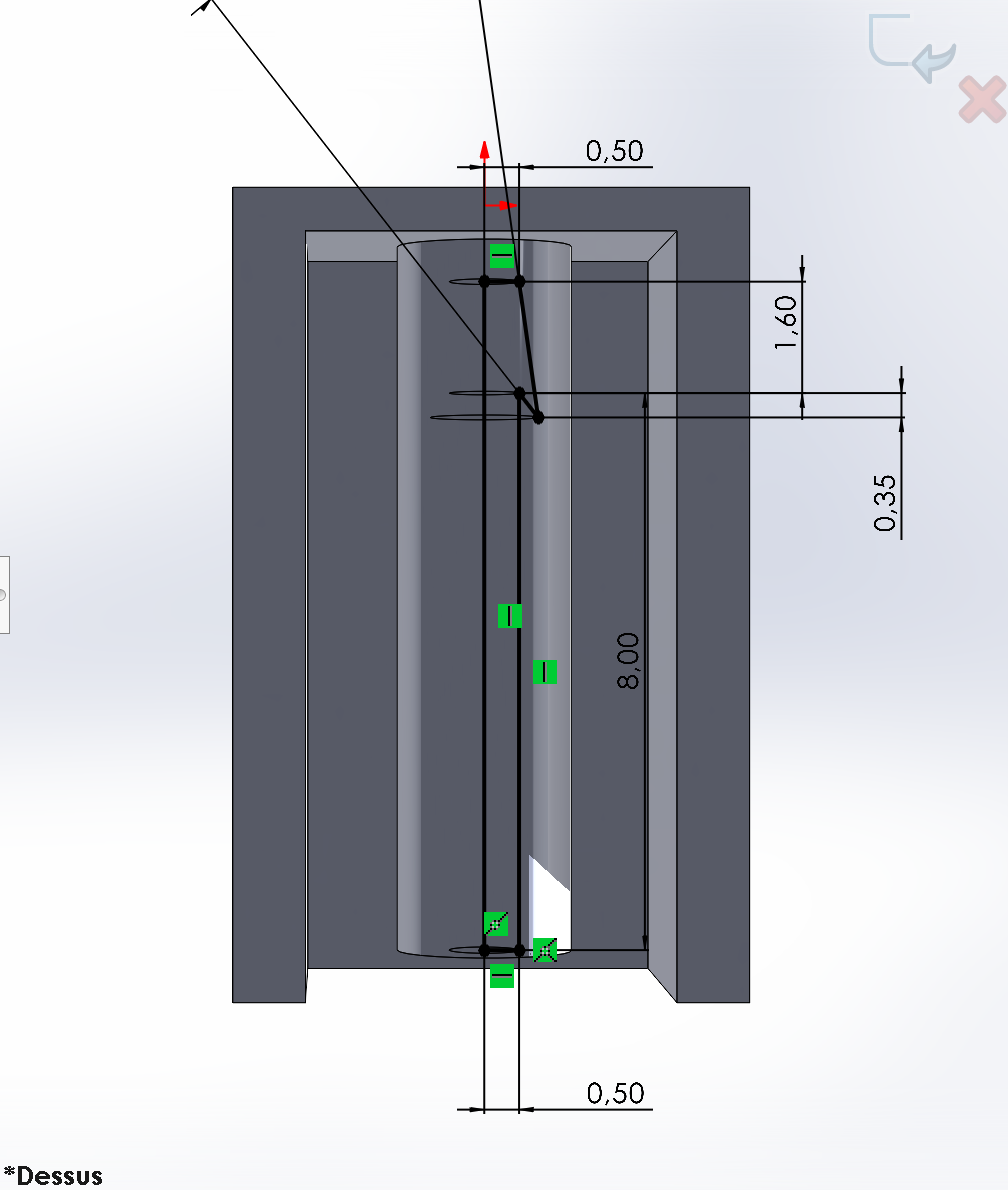 Comme on peut le voir sur l'image ci-dessous, nous avons pris soin de creuser en son centre la flèche qui viendra se loger dans l'embout femelle afin de s'assurer que sa déformation permettra bien de faire clipser les 2 pièces. Nous avons porté une attention toute particulière aux mesures en prenant des marges d'erreur afin de ne pas être surpris par la dilation du plastique ou par des défauts/imperfections d'impressions (récurrents en impression 3D).