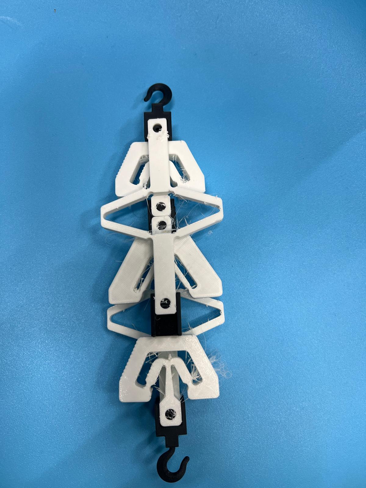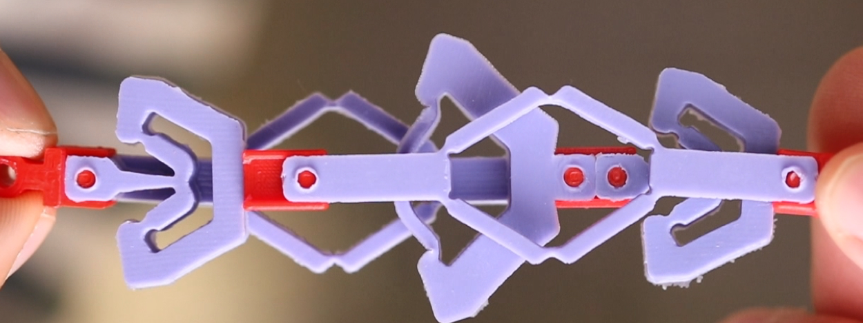 Nous avons choisi de recréer le Counter-Snapping Mechanism (voir image et vidéo) de l'article de Paul DUCARME and al. Notre choix se porte sur le fait que les ressorts d'un tel mécanisme ont tout intérêt à être imprimés en 3D car le choix d'un filament, comme le TPU dans notre cas, permet de réduire les risques de cassures d'un plastique rigide mais aussi d'augmenter l'effet élastique du mécanisme. D'un autre côté, nous avons aussi décidé de modifier un des deux types d'accroches (qui permettent de relier les différents ressorts) en réfléchissant à un système de clip décrit plus tard dans cette documentation.