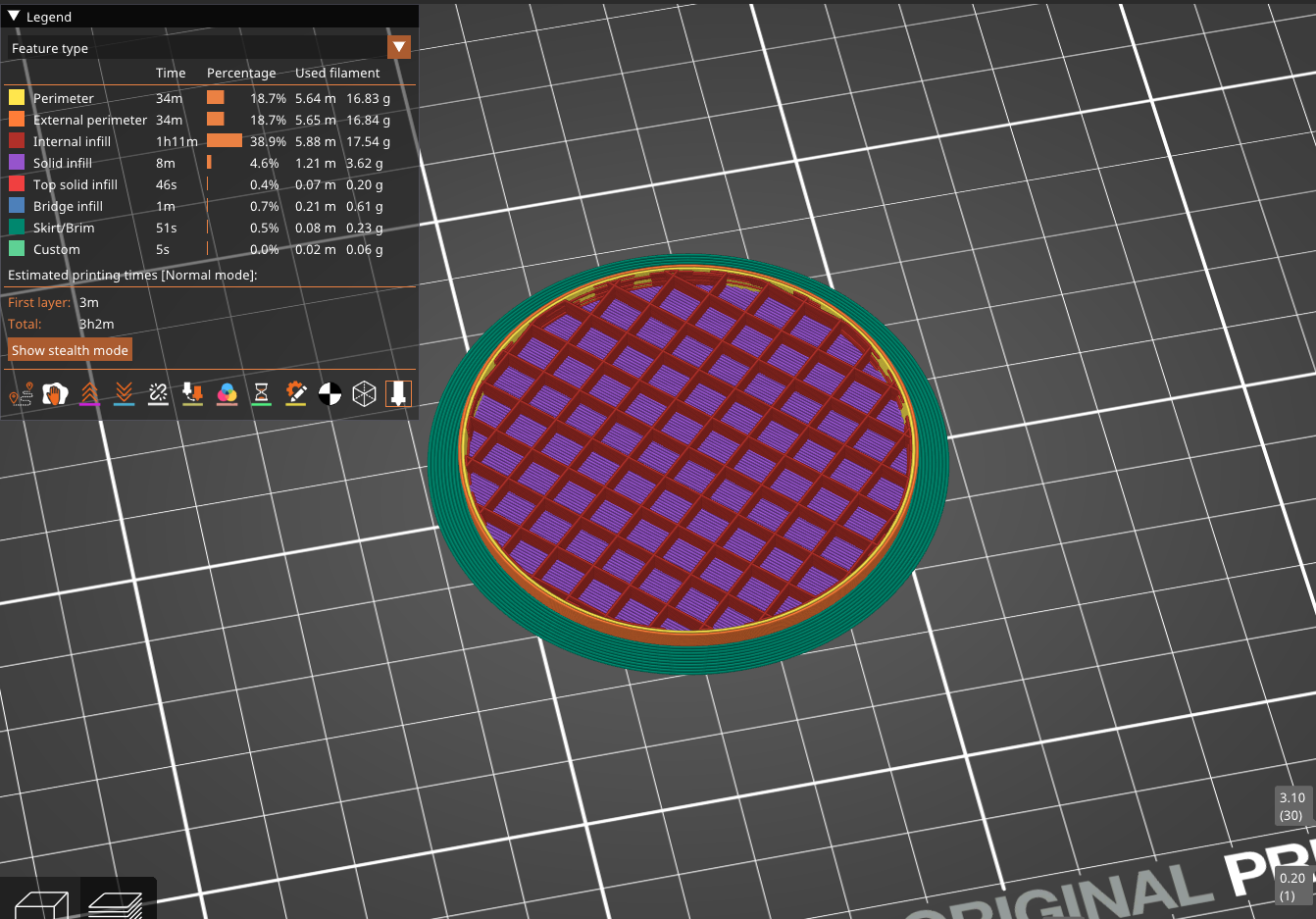 Le passage du fichier STL au G-code a été effectué sur PrusaSlicer. Pour ce modèle, nous avons privilégié deux réglages avancés pour compenser la hauteur de l'objet et les contraintes de pression hydraulique.