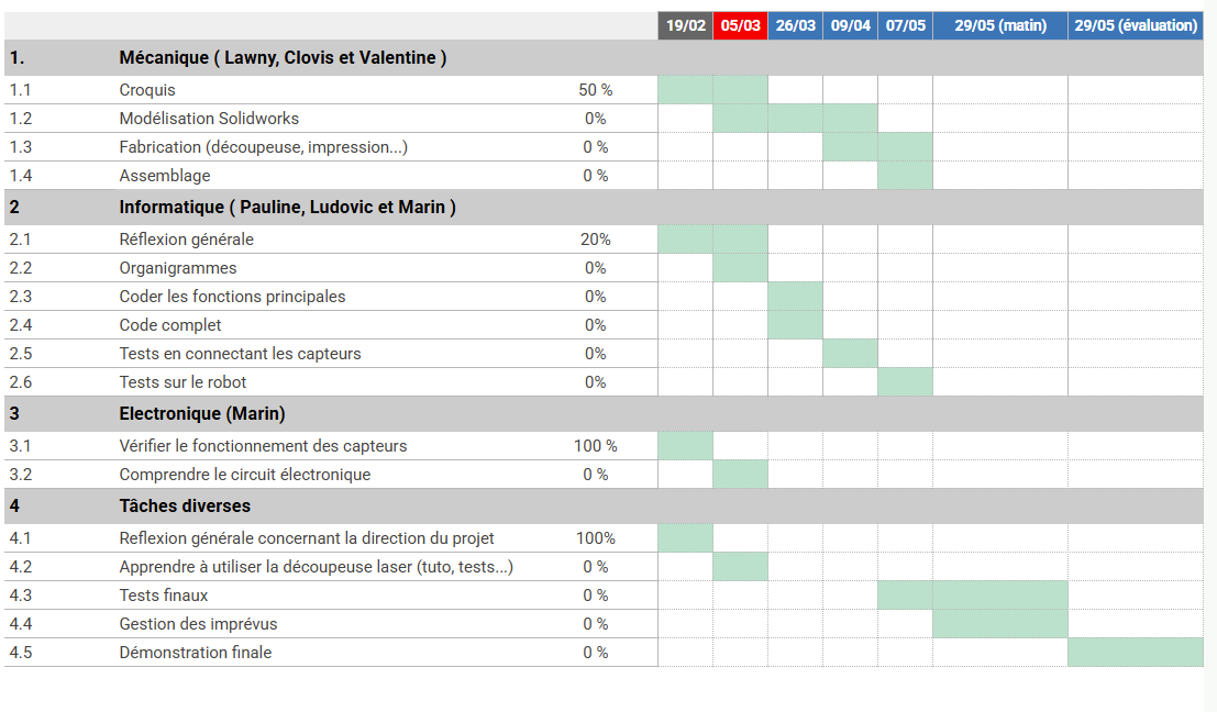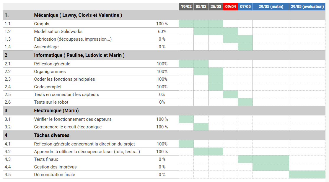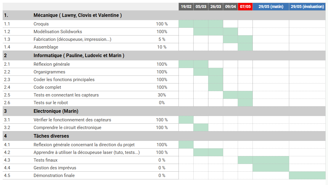 Nous avançons globalement dans les temps par rapport à notre diagramme de Gantt. La partie mécanique nous semble correcte et prête à être découpée, à part pour la partie tenons et mortiers qui doit être peaufinée avant la prochaine séance. On prévoit de finir l'assemblage du robot la semaine prochaine et de tester enfin le déplacement du robot en condition réelle.