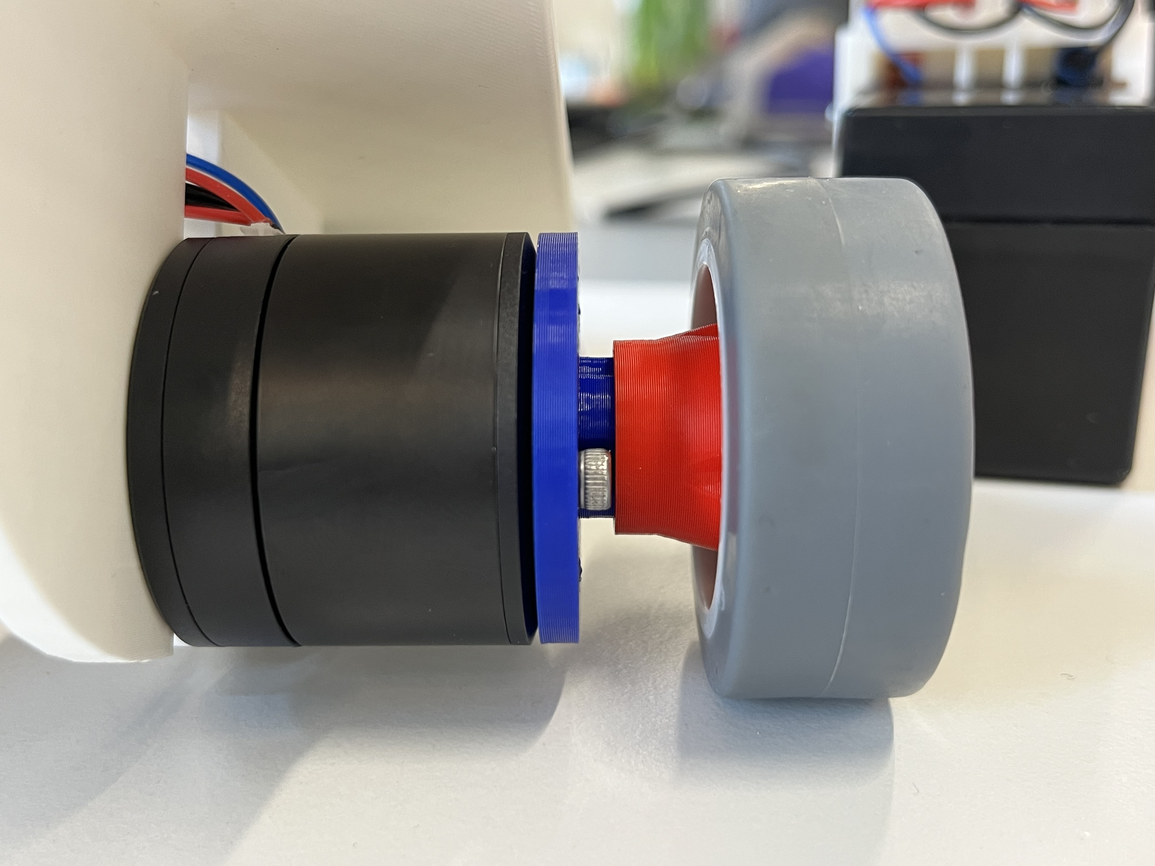 On a également commencé à assembler ce qui pouvait déjà être assemblé. Nous avons ainsi lié chacun des 2 moteurs aux roues arrières, essentiellement à l’aide de vis, et par l’intermédiaire de 2 pièces imprimées en 3D qui ont pour rôle d’assurer le bon guidage.