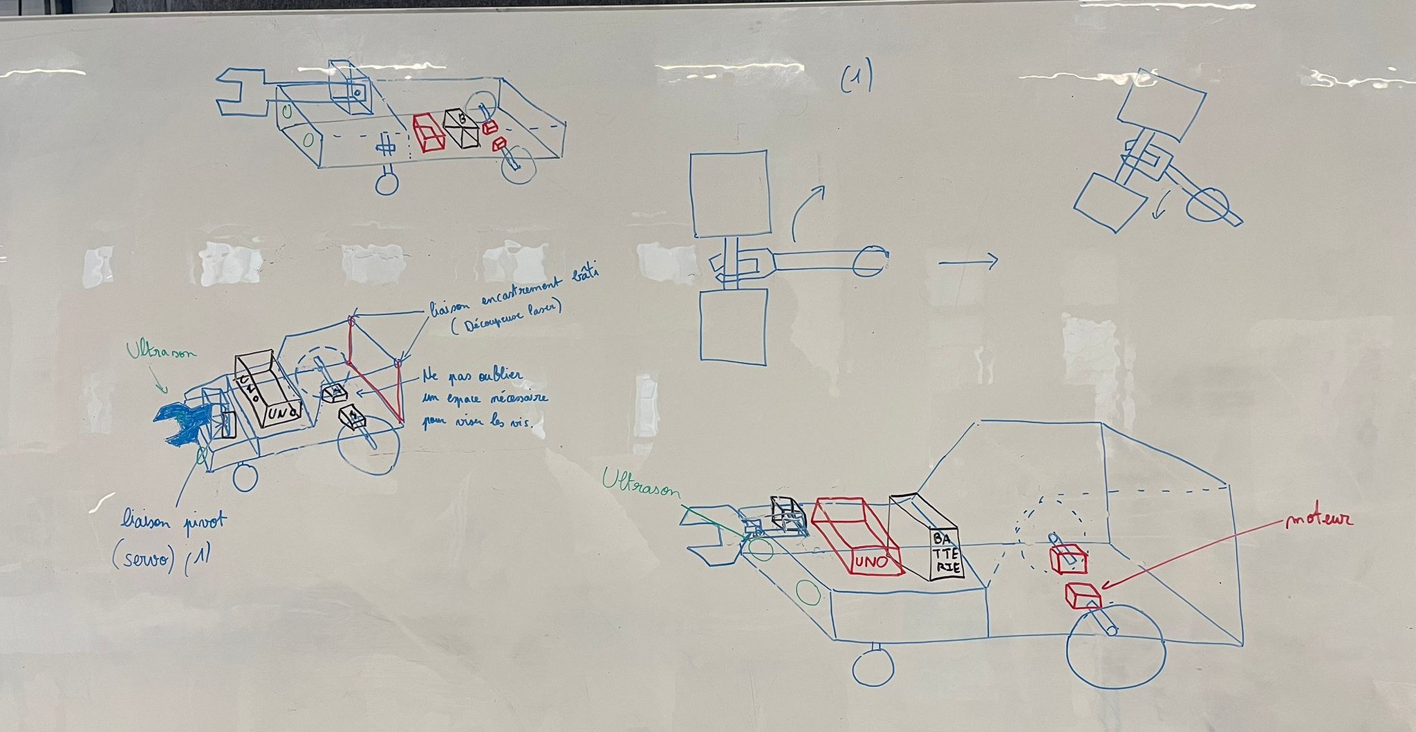 En parallèle, nous avons vérifié toute notre solution 3D pour s'assurer que les câblages et fixations entre chaque pièce soient réalisables. Nous avons décidé de rajouter des ouvertures pour faire passer les fils et des équerres pour solidifier le chassis. Aussi, nous avons réalisé que nous avions placé les deux capteurs ultrasons à l'avant de robot et cela pourrait nous causer des problèmes. C'est pour cela que nous avions décidé des faire un châssis modulable, permettant soit de mettre les deux capteurs à l'avant du robot, soit de mettre un capteur à l'avant et un autre sur le côté.