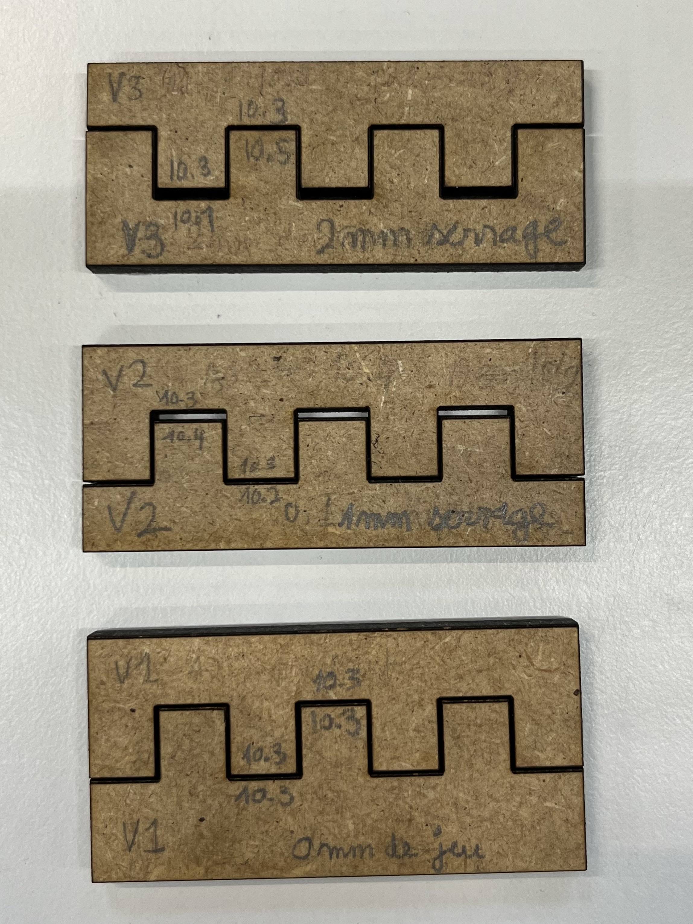 Pour ce premier test, nous avions choisi un jeu de 0mm entre les tenons et mortaises. L'ajustement est glissant alors que nous souhaitions davantage un ajustement serré afin que les pièces tiennent entre elles. Il faudra donc tester avec d'autres dimensions pour trouver le réglage parfait. C'est un travail qui pourra être continué sur la prochaine séance.