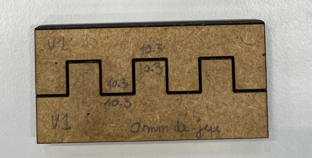 Nous nous sommes intéressés en parallèle à la découpeuse laser. L’objectif était notamment de déterminer les réglages nécessaires pour que l’assemblage par tenons et mortaises soit suffisamment précis et serré, afin que les pièces restent solidaires par la suite. A l'issu de la séance, un premier test a pu être réalisé.