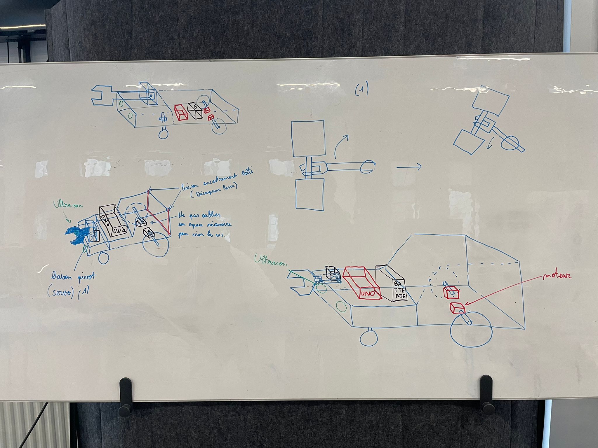 Nous avons tous ensemble réfléchi à une solution qui pourrait répondre à ce cahier des charges. Nous avons notamment réfléchi à la solution mécanique d'attraper le totem de la façon la plus simple possible. Nous nous sommes arrêtés à une solution reposant sur une pince liée au chassis par une liaison pivot. Voici un premier croquis construit pendant la séance.