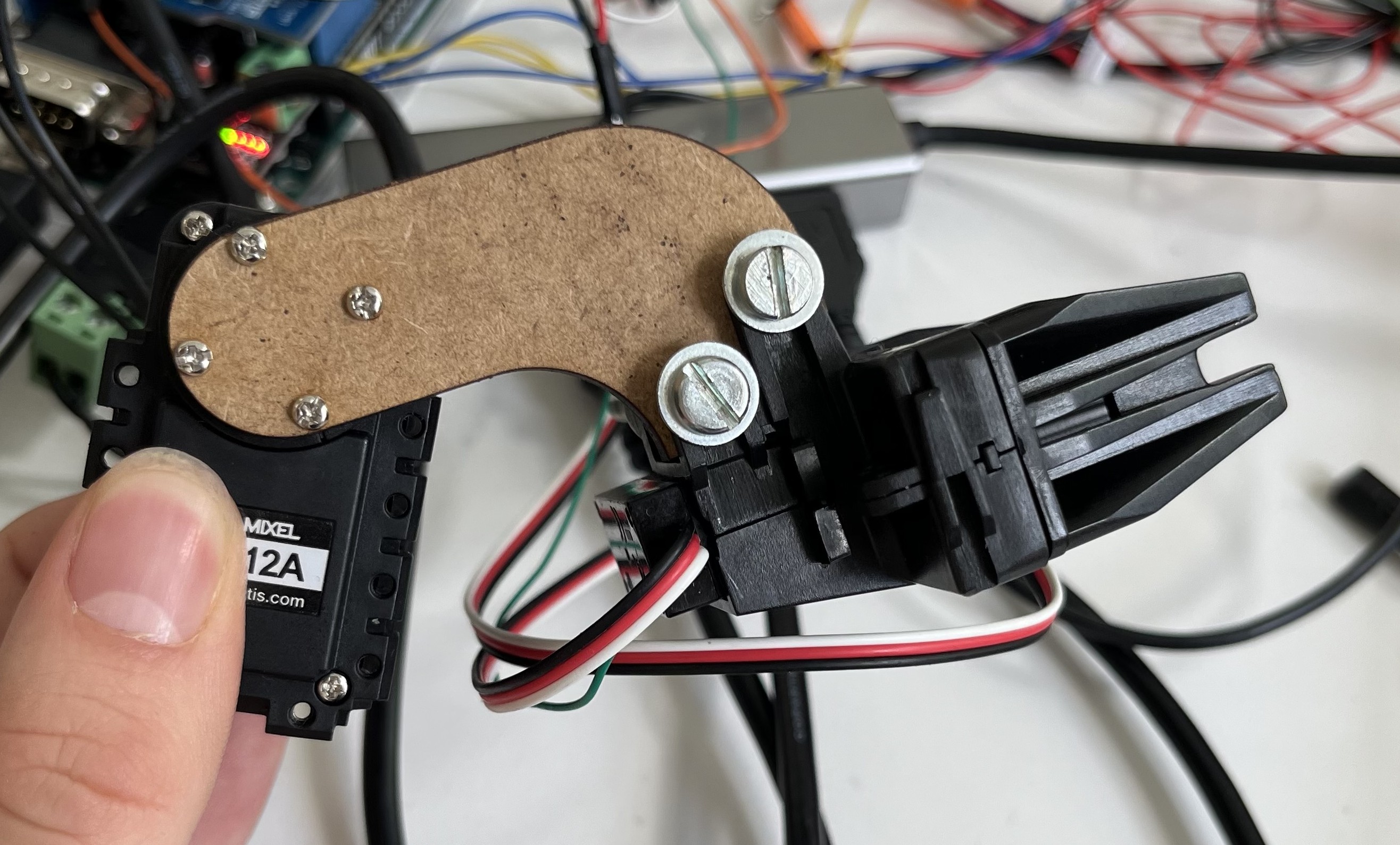 Le bras entre la pince et le moteur Dynamixel a pu être modélisé. Nous nous sommes arrêtés sur une solution plus simple que présentée dans le croquis de la dernière séance. La solution finale est fabricable en une pièce par découpeuse laser. Nous avons directement pu fabriquer cette pièce et faire l'assemblage avec le moteur dynamixel d'un côté et la pince de l'autre en s'aidant de boulons. Cela nous a permis de commencer à faire des tests côté électronique.
