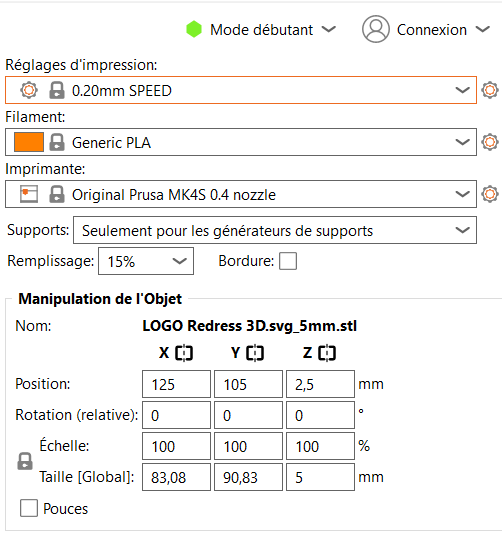 En mode débutant, paramétrage de l'impression et de la taille de notre logo de manière à obtenir une impression rapide (environ 20 min).