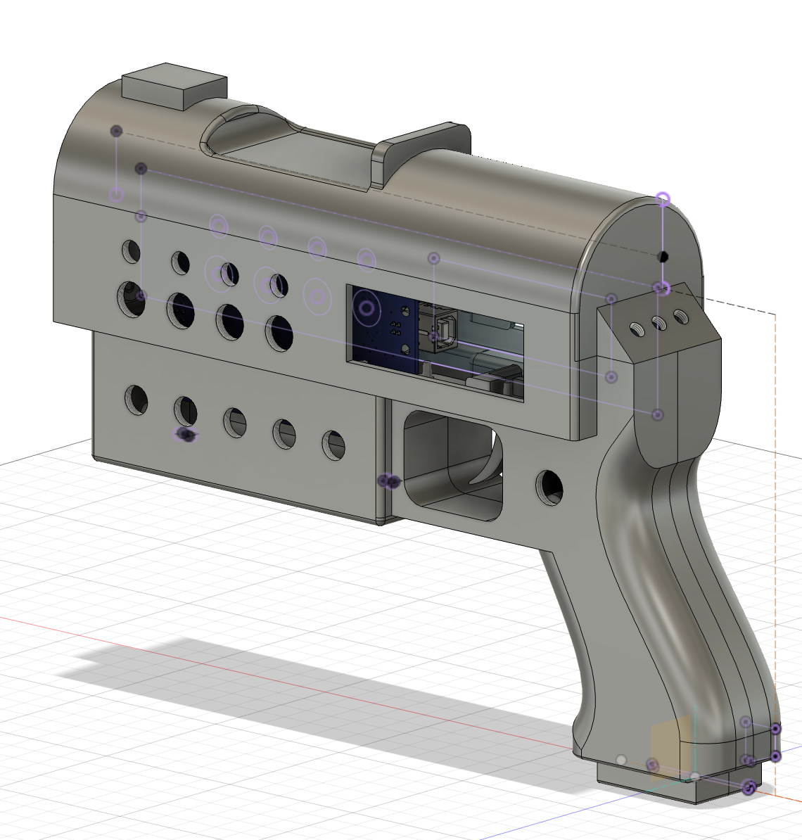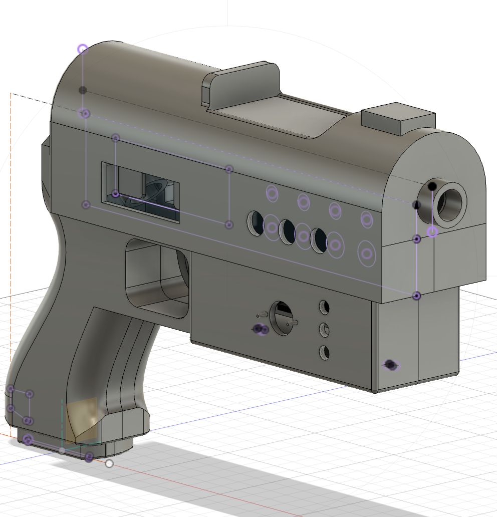 Le projet a été conçu pour nous permettre de développer nos compétences de modélisation 3D sur Autodesk Fusion et d'électronique. Il vise à critiquer le port d'arme en général, en créant un futur imaginaire absurde.