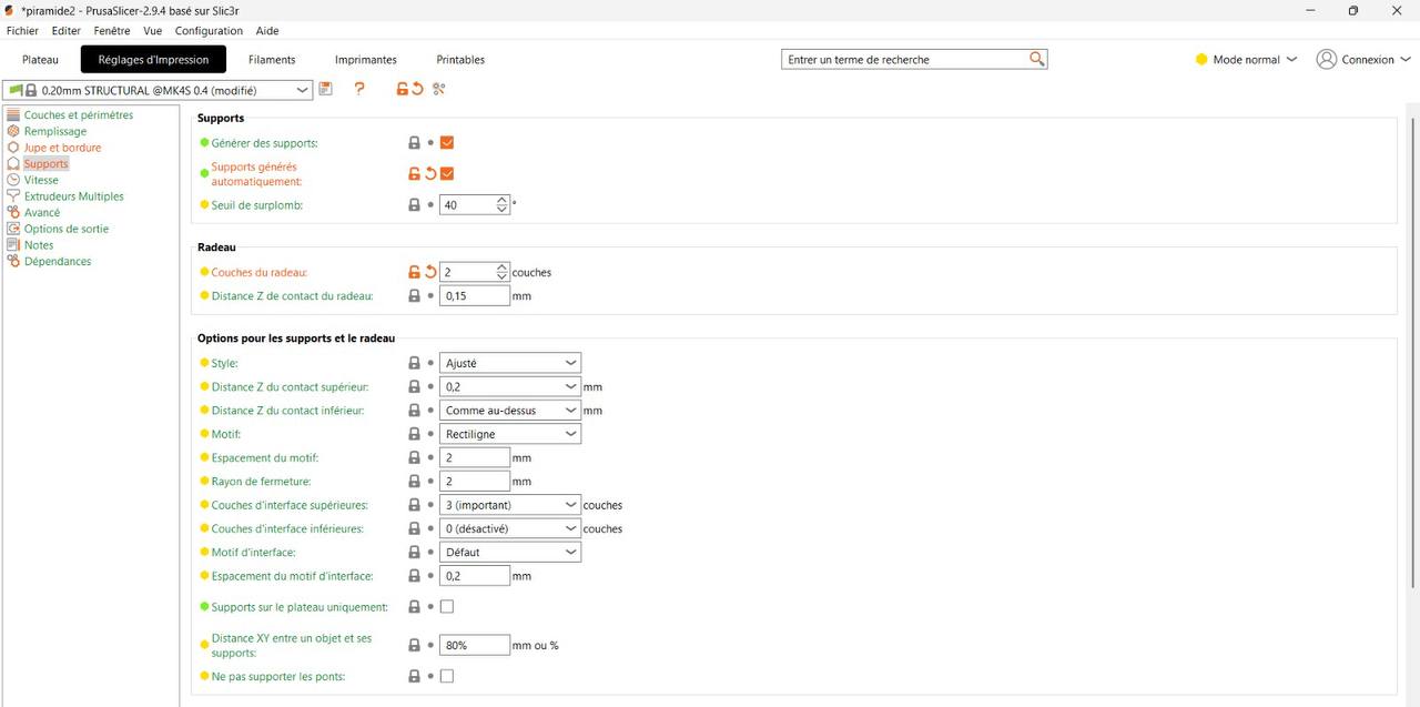 Paramètres d'impression: support partout avec bordure, paramètres par défaut de PrusaSlicer (qualité standard, épaisseur de couche classique)