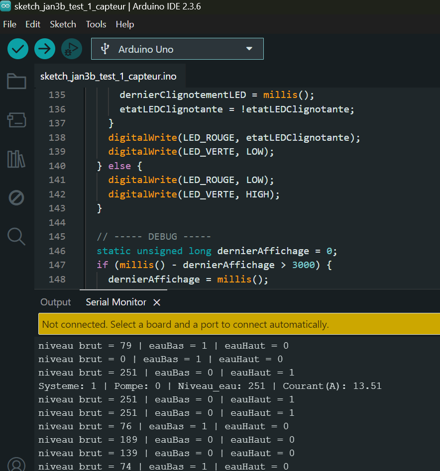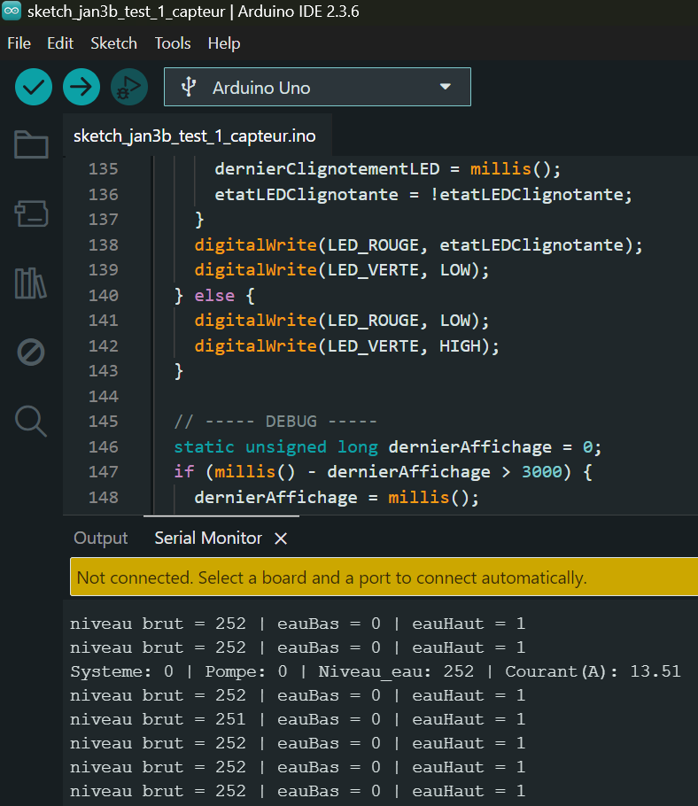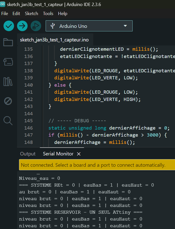 Si le niveau d’eau dans le réservoir est inférieur au seuil bas fixé (100), l’affichage « eauBas = 1 » apparaît dans la sortie de l’IDE ; dans le cas contraire, « eauBas = 0 » est affiché.