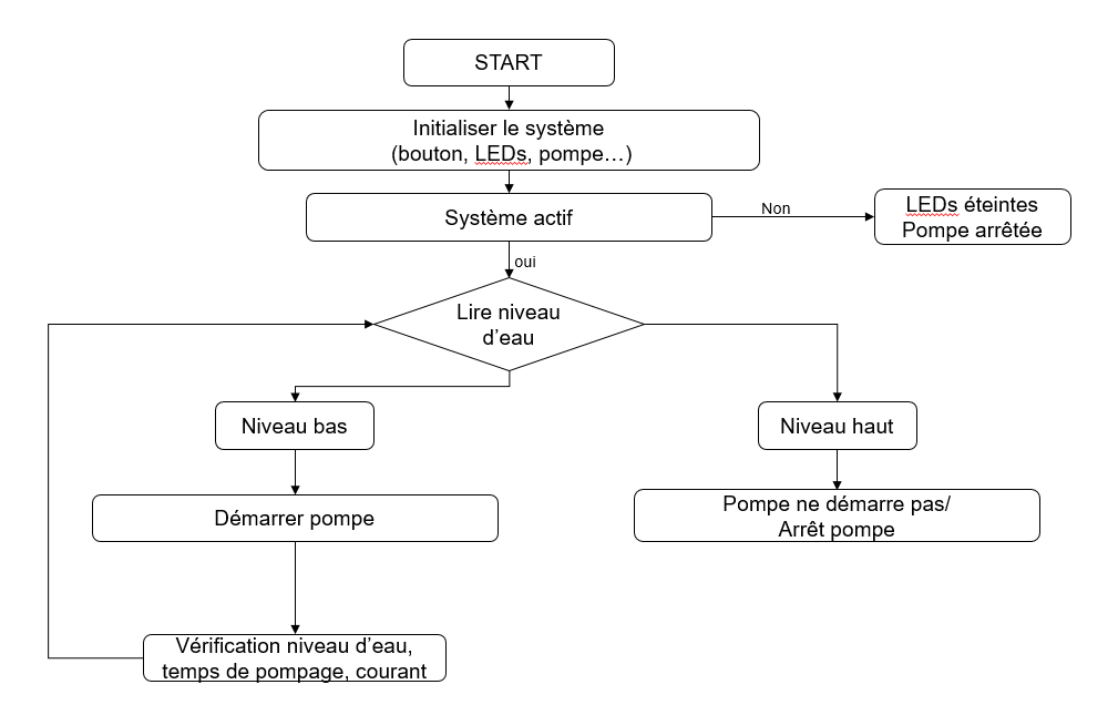 Une fois le système mis en marche, les états initiaux renvoyés par les capteurs sont pris en compte par le système. En fonction des boucles de commande définies dans le code, la pompe se met en marche ou non selon les paramètres de configuration établis.
