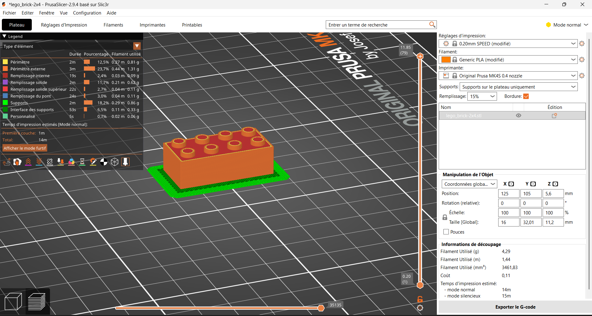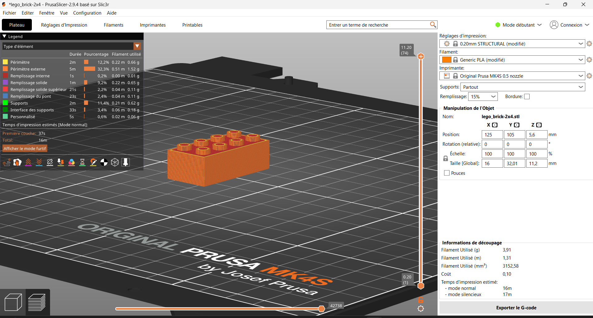 Le modèle a été importé dans le logiciel slicer PrusaSlicer puis préparé pour l’impression 3D.