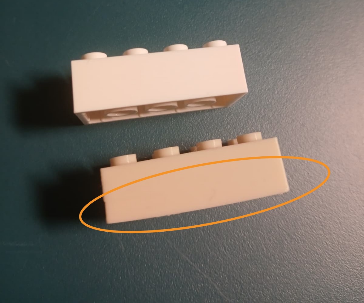 Après l’impression, la pièce a été retirée du plateau et nettoyée de ces supports avant les tests d’assemblage avec de vraies briques LEGO.