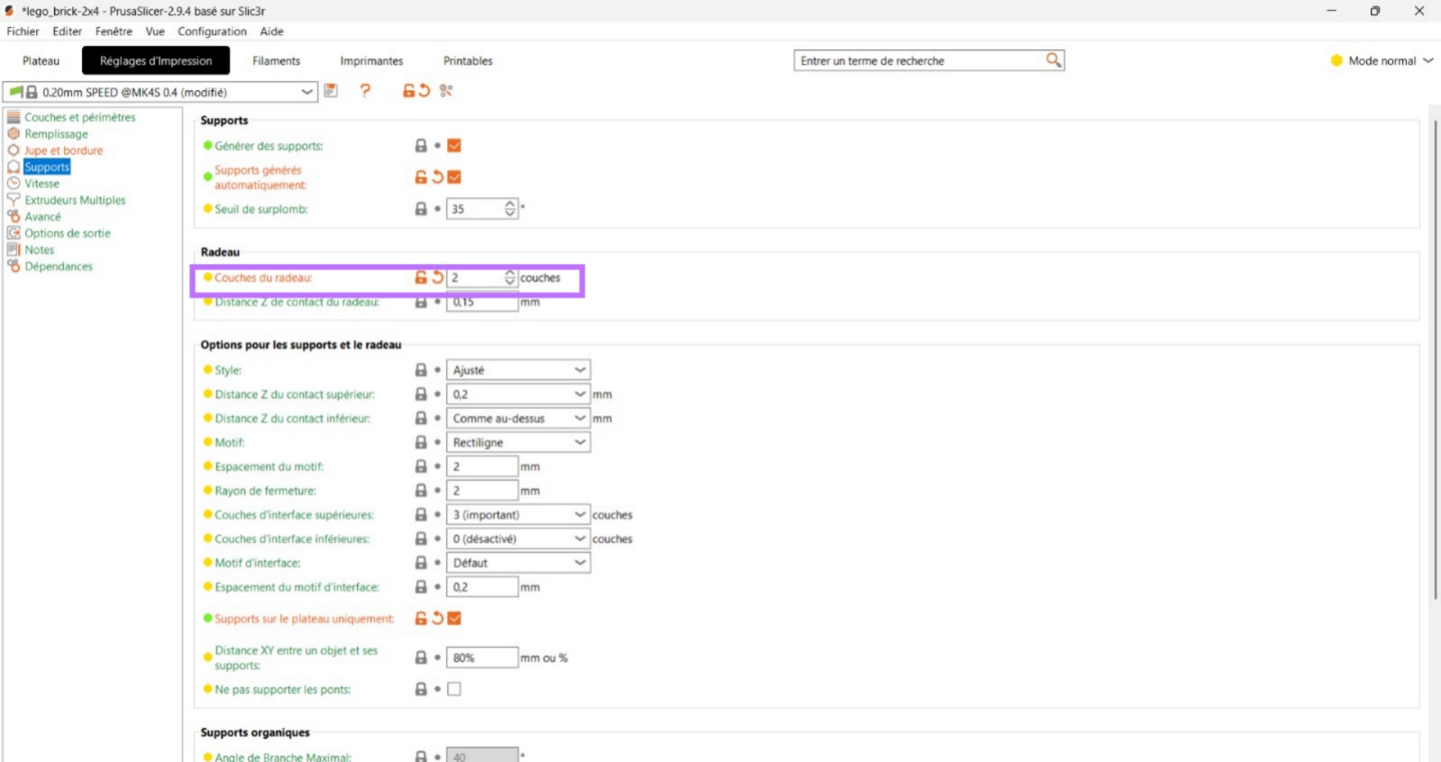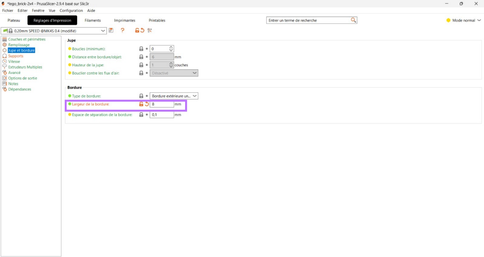 Afin de limiter ces problèmes, j’ai effectué des recherches supplémentaires et utilisé le mode normal de PrusaSlicer, ce qui permet de modifier davantage les paramètres pour améliorer l’adhérence au plateau et réduire le warping :