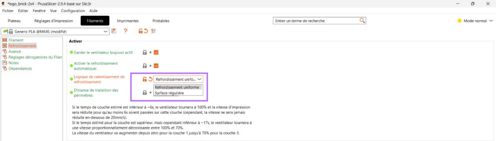 la logique de ralentissement du refroidissement a été réglée sur « Refroidissement uniforme » pour garder une température plus stable, surtout sur les couches imprimées très rapidement, ce qui évite les gros écarts de chaleur responsables des déformations.