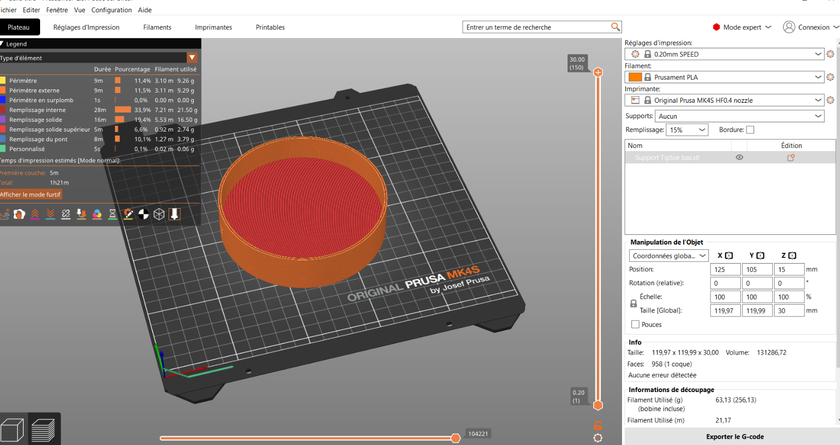 - Remplissage interne Ă 15% pour l'isolation, couche de 0.2mm pour la finition.