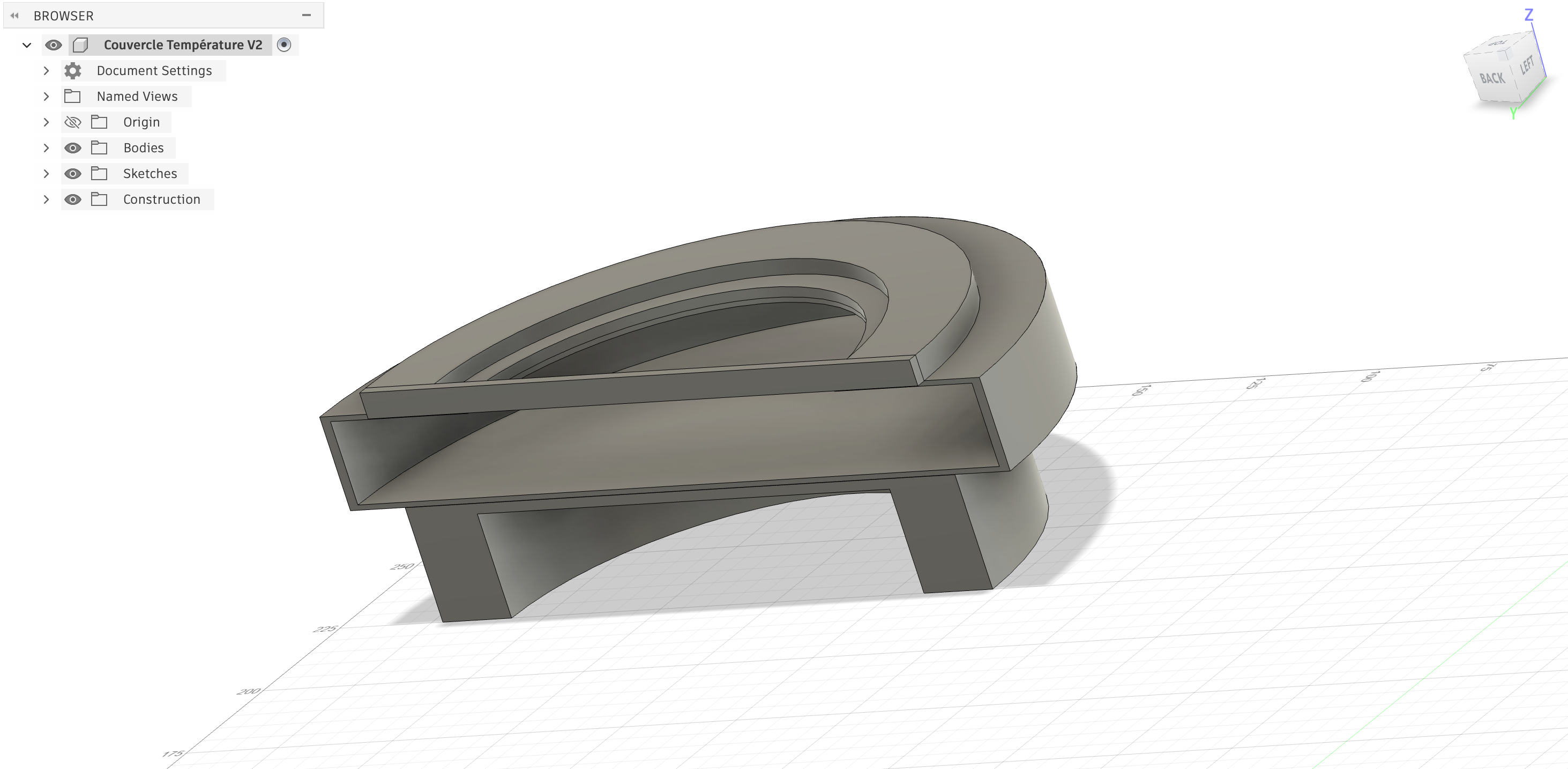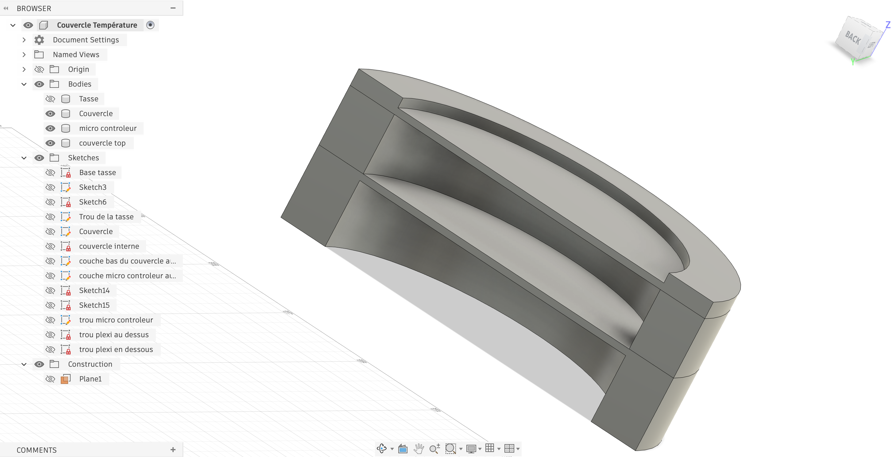 Le modèle a ensuite été réalisé sur Fusion 360, où nous avons conçu la forme de l’objet, ajouté des parois légères et prévu des emplacements pour les composants électroniques comme la LED, tout en ajustant le design pour qu’il puisse être facilement imprimé en 3D.