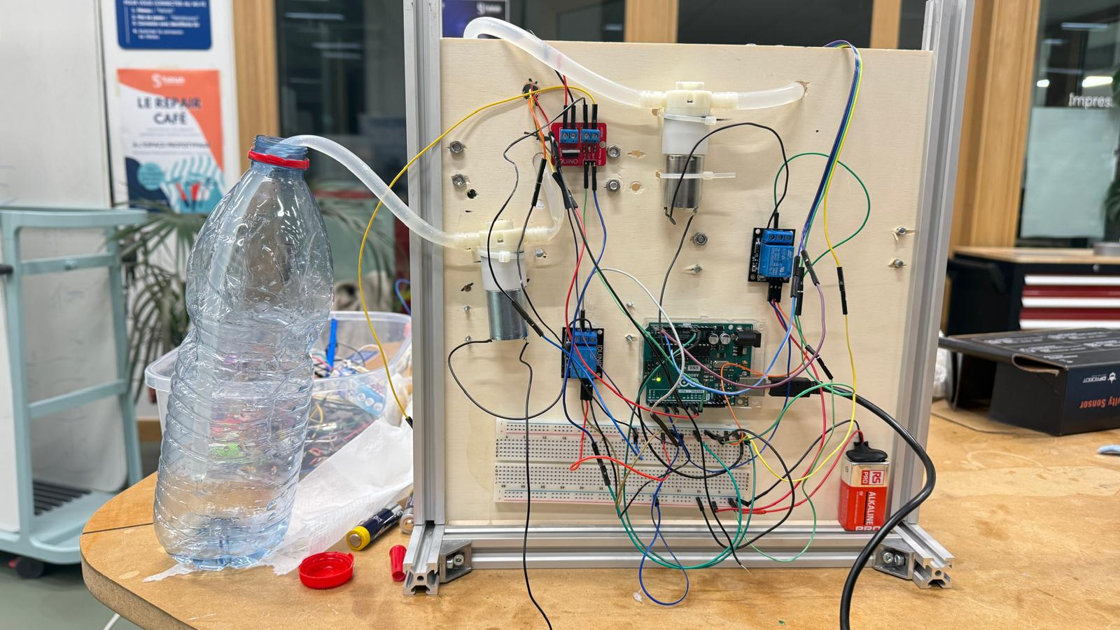 Adaptation au matériel électronique utilisé et test du matériel à l’aide de codes sur l’IDE Arduino. Nous avons également étudié et réalisé le câblage des différents composants (pompe, relais, carte Arduino, batterie), en suivant les schémas de connexion adaptés. Le branchement des composants est détaillé dans l’ Annexe 1.