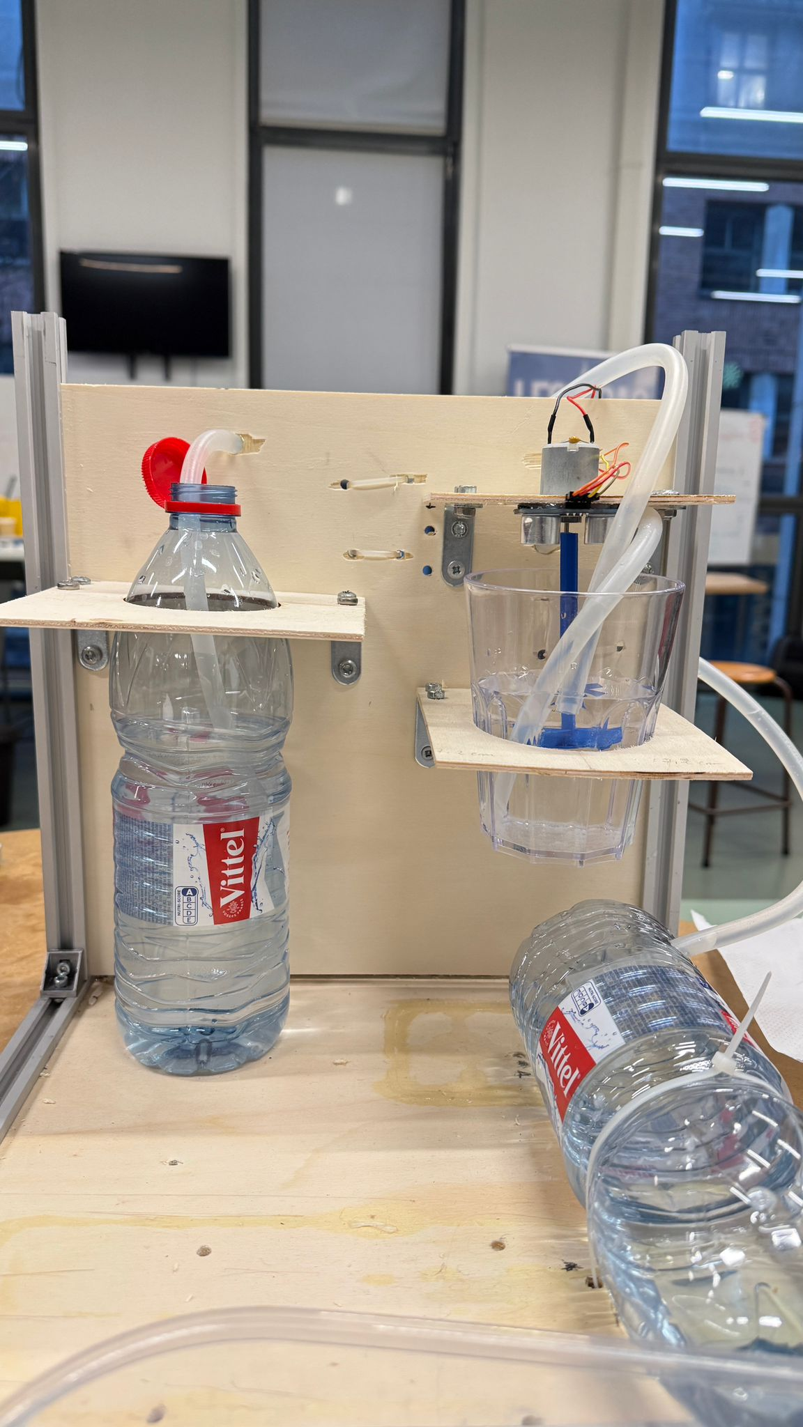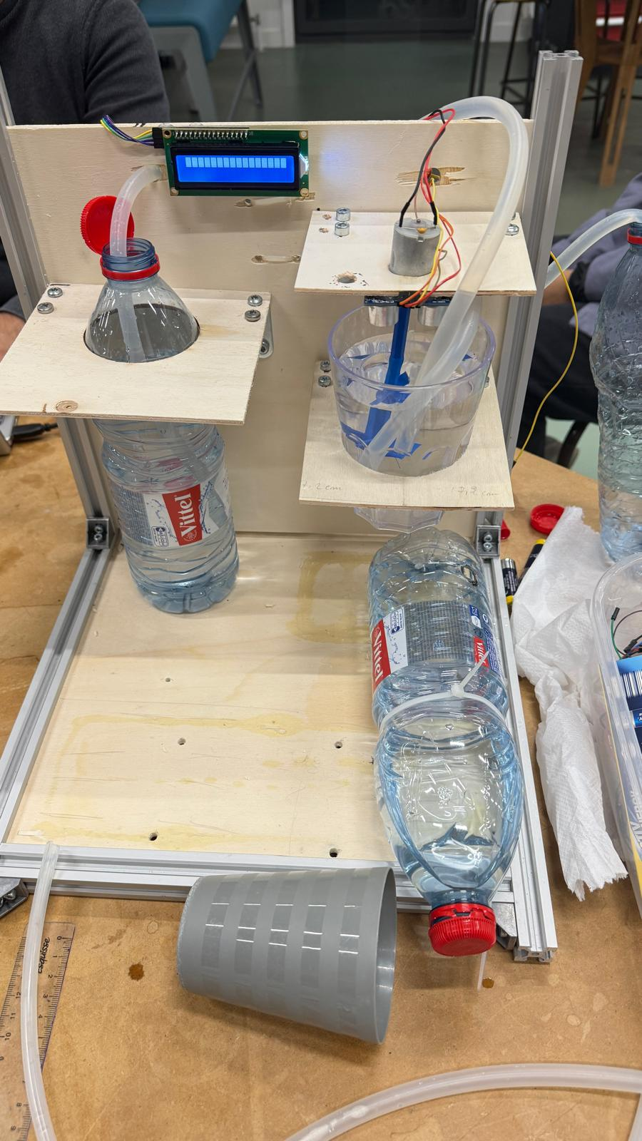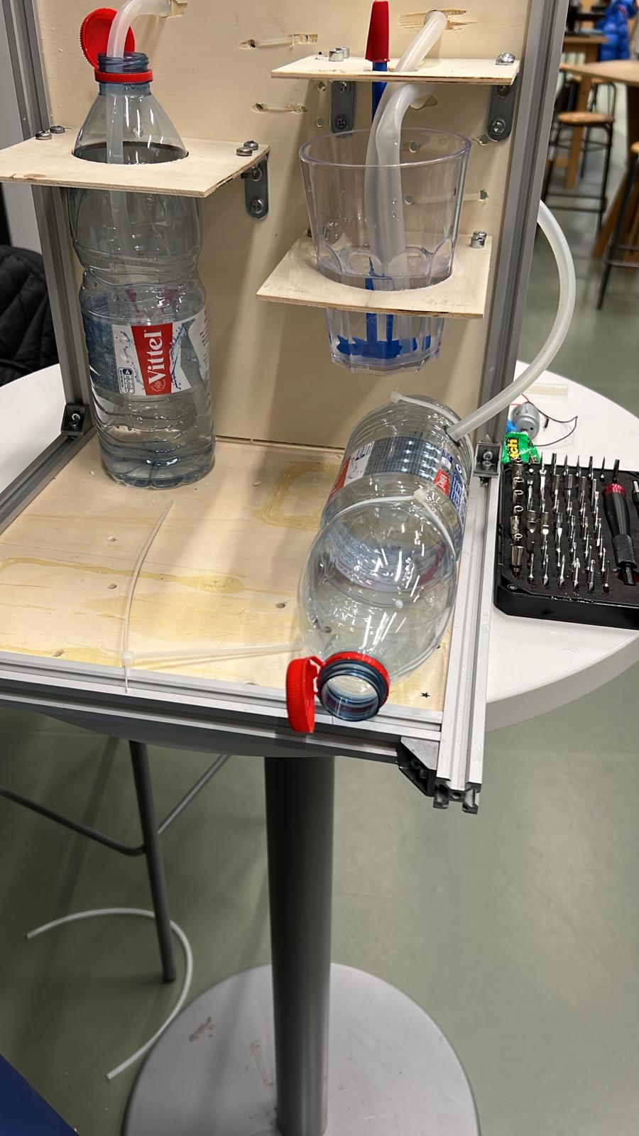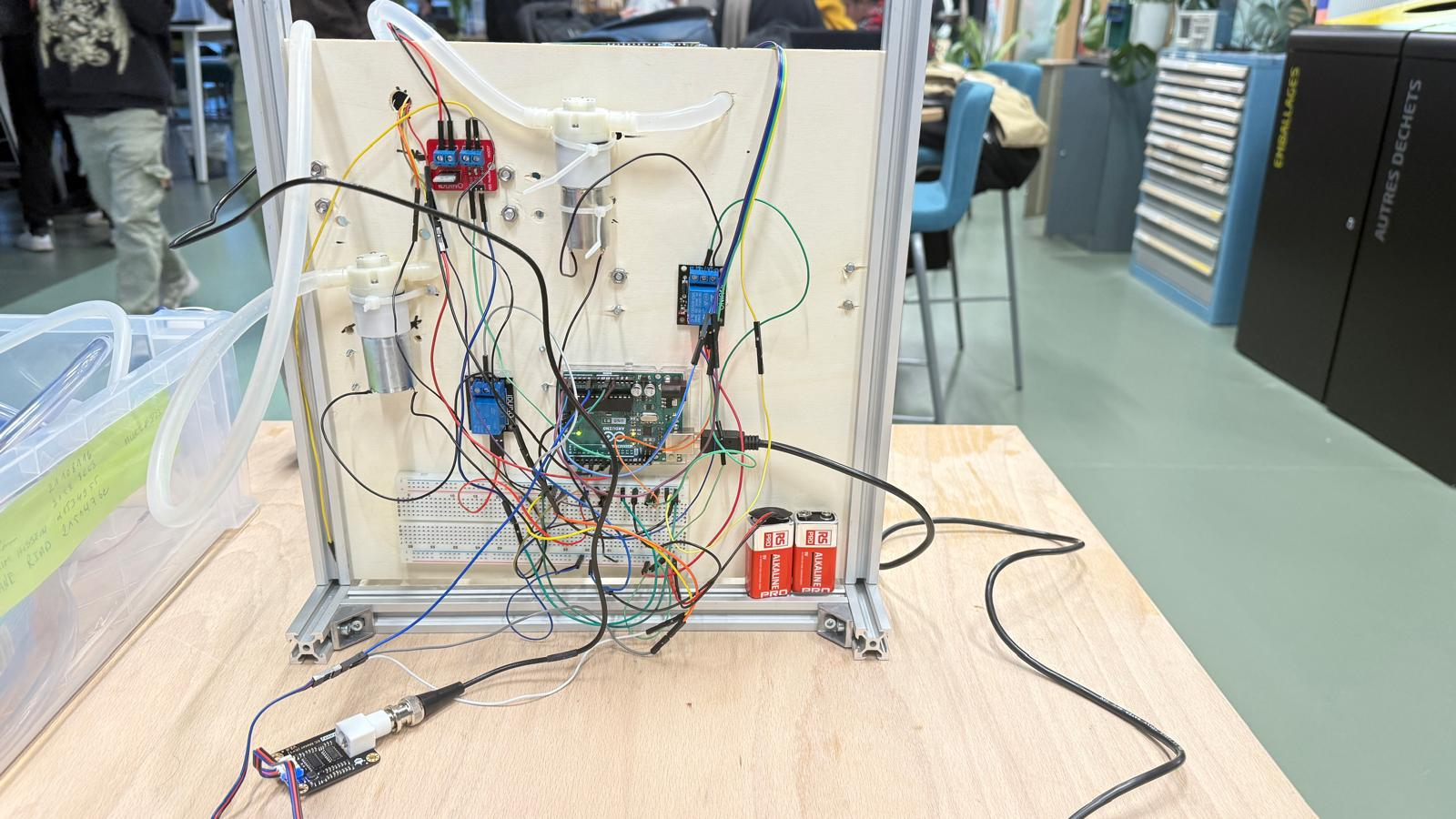 - 8 décembre 2025 - Intégration d’une première pompe et préparation du bac d’alimentation Lors de cette séance, nous nous sommes concentrés sur l’intégration de la première pompe et sur l’emplacement optimal du bac d’alimentation en eau et de la pompe. Il faut s’assurer un transfert fluide entre le bac d’alimentation et la cuve, tout en tenant compte des contraintes d’encombrement et de passage des tuyaux. Après repérage, nous avons percé les ouvertures nécessaires pour le passage des câbles et des conduites.