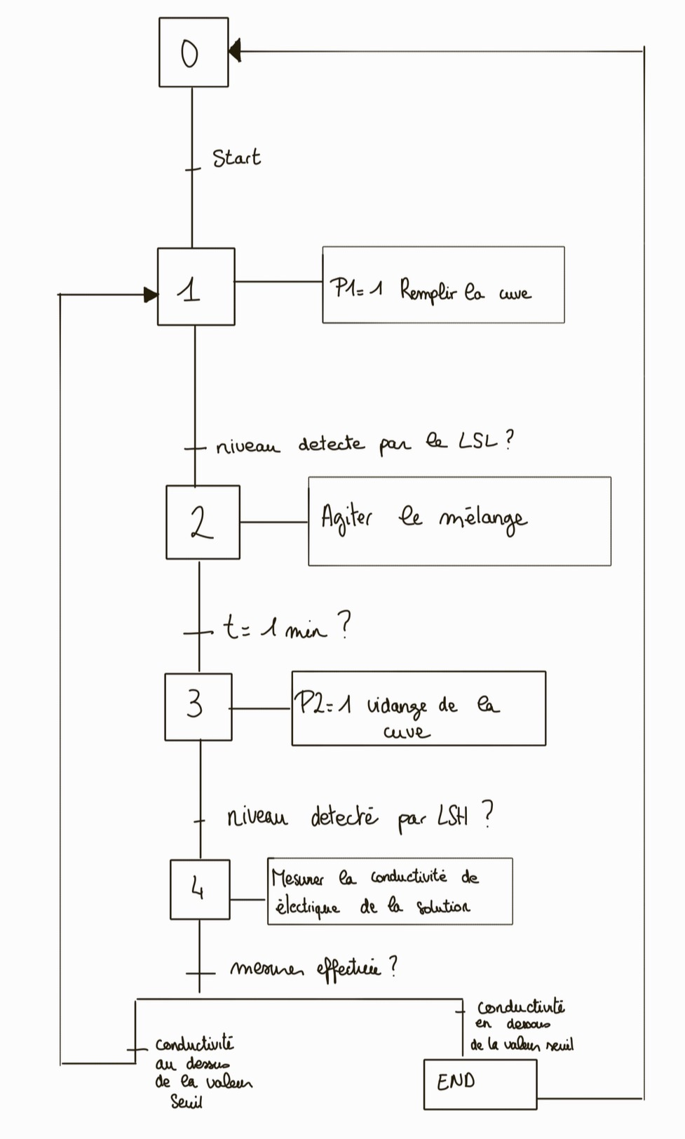 Pour des raisons de temps et de difficulté, nous avons simplifié le sujet avec Monsieur Pulpytel : Le projet consiste maintenant à concevoir et automatiser un procédé expérimental ayant pour objectif d’étudier l’efficacité de cycles successifs de lavage à l’eau d’une cuve contenant initialement du chlorure de sodium (NaCl). L’enjeu principal est de déterminer, de manière automatique, après combien de cycles de nettoyage la cuve peut être considérée comme propre, c’est-à-dire lorsque la conductivité de l'eau de nettoyage devient inférieure à un seuil défini.