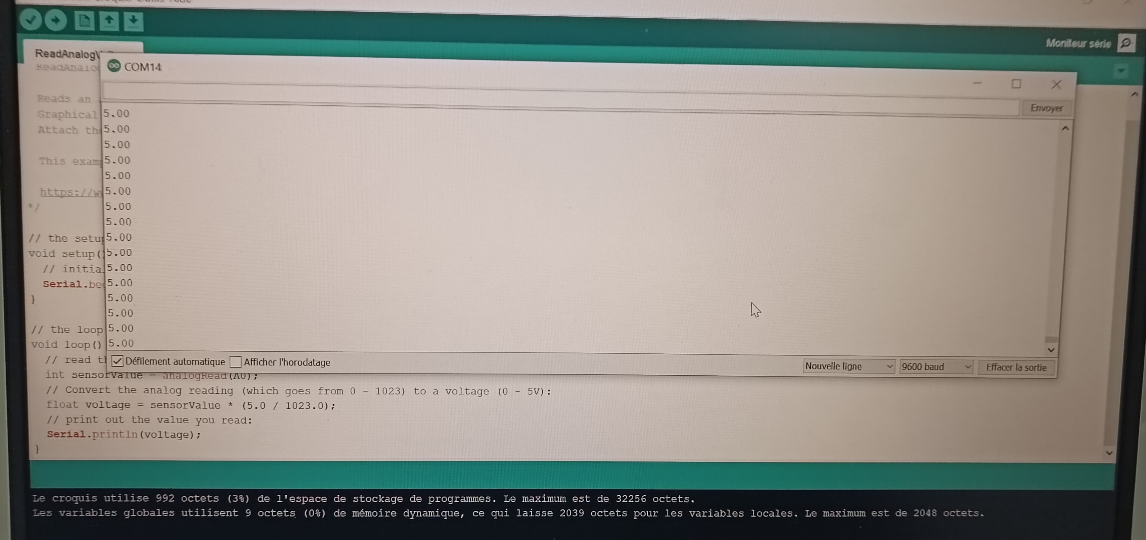 La valeur mesurée (entre 0 et 1023) est envoyée au moniteur série