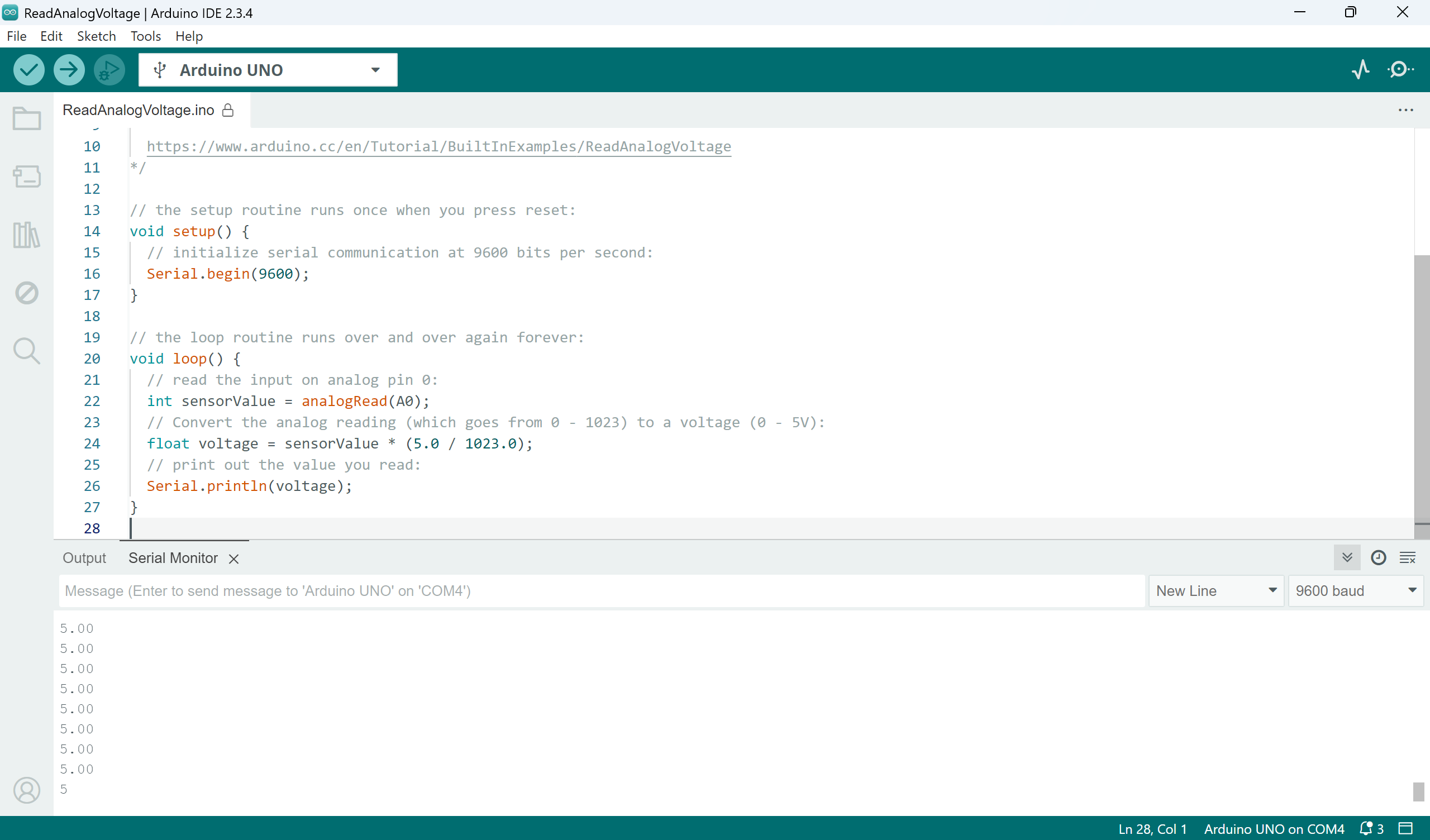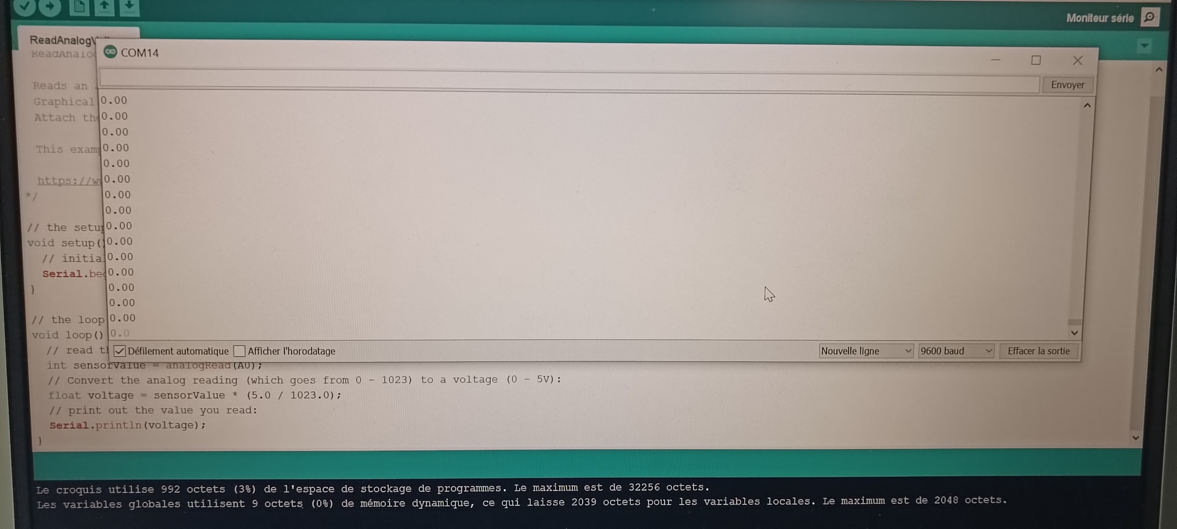 Le programme Read Analog Voltage permet de lire une valeur analogique sur une entrée de la carte Arduino et de l’afficher dans le moniteur série.