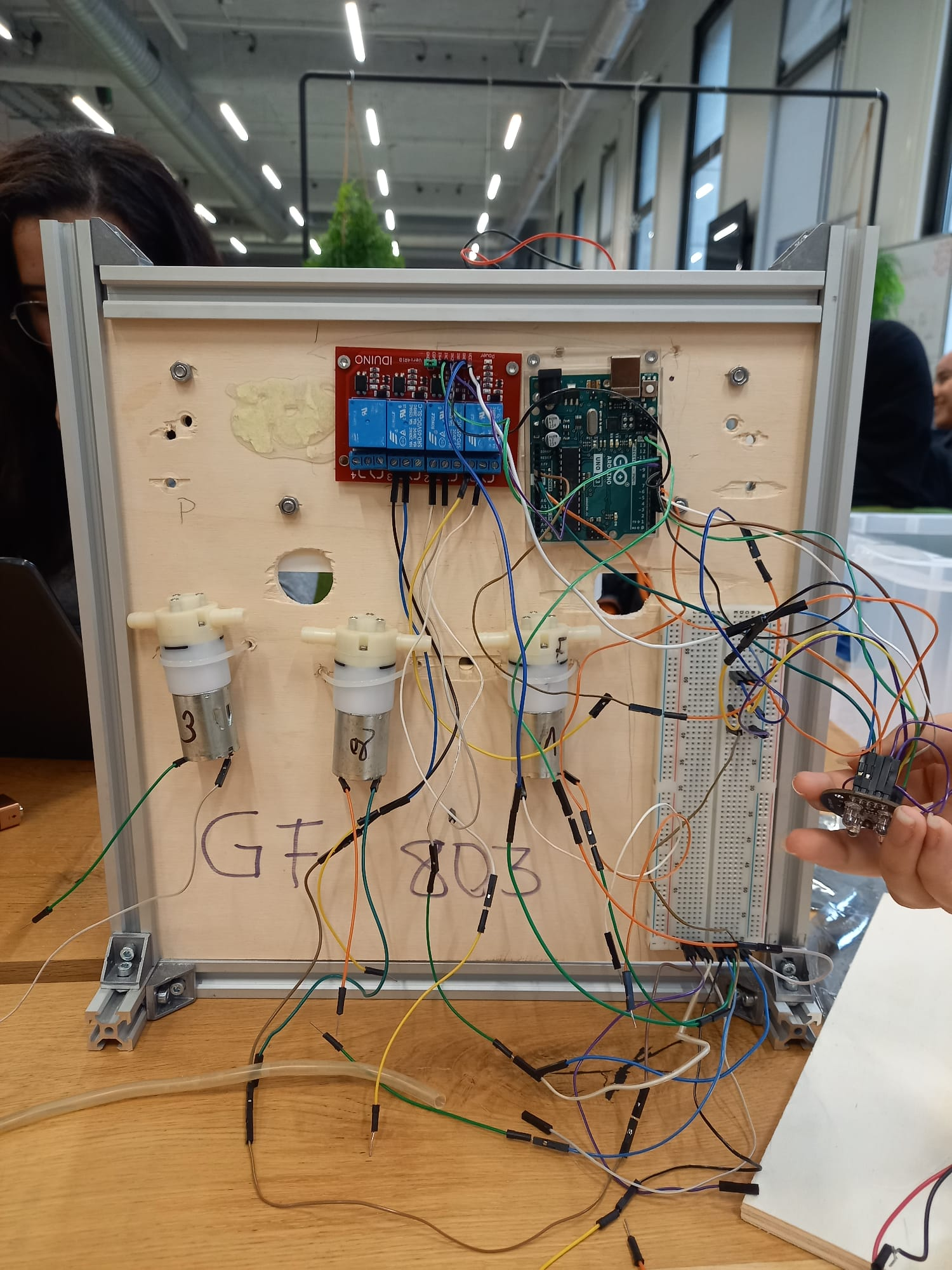 Nous avons ensuite procédé par étapes, ce qui nous a permis de tester le fonctionnement du circuit au fur et à mesure et de corriger les erreurs plus facilement. Pour cela, nous avons d'abord branché une seule pompe avec sa pile sur l'Arduino puis nous avons testé son fonctionnement :