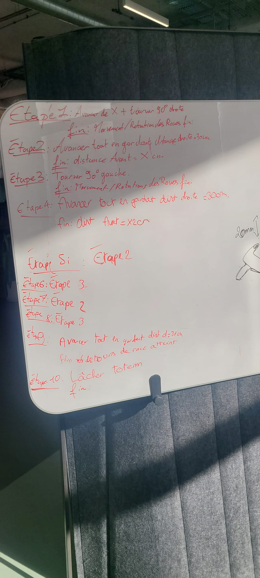Lors de cette séance, le pôle informatique a commencé la création du programme en définissant sa structure générale. Pour cela, nous avons d’abord réfléchi en groupe aux fonctions clés du programme — notamment comment suivre le mur, atteindre le totem puis rejoindre le point de dépôt — afin de nous coordonner sur un fonctionnement à la fois simple et optimal.